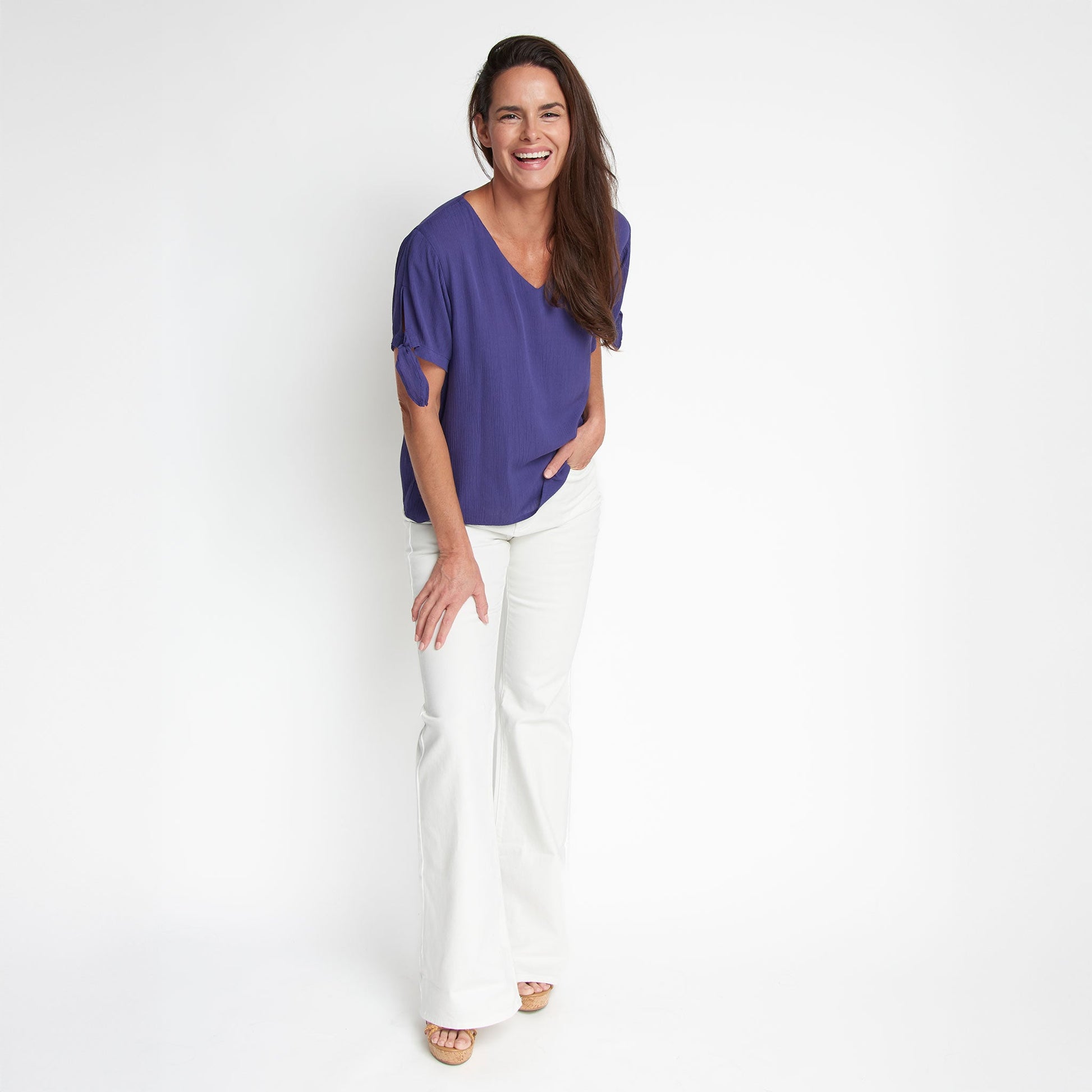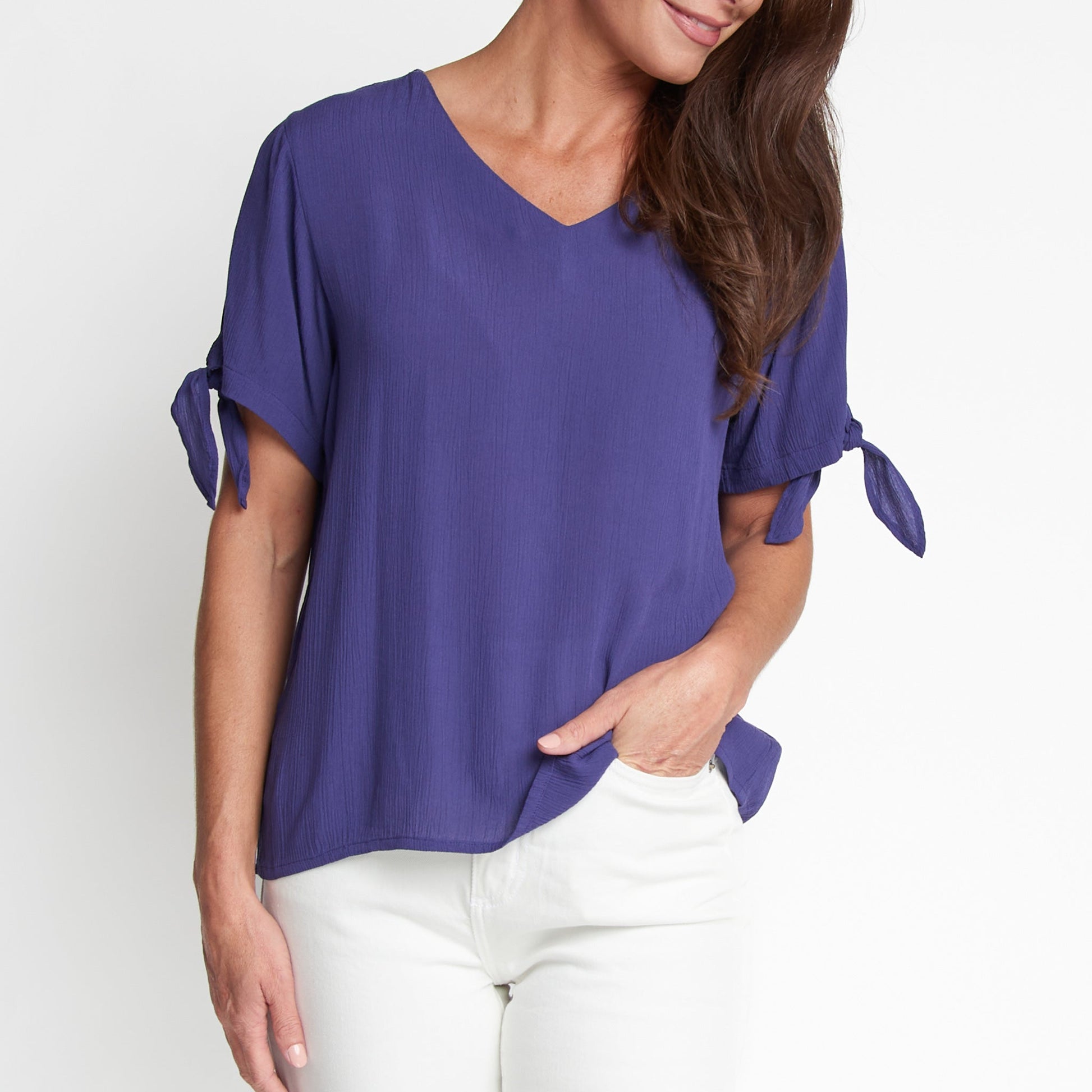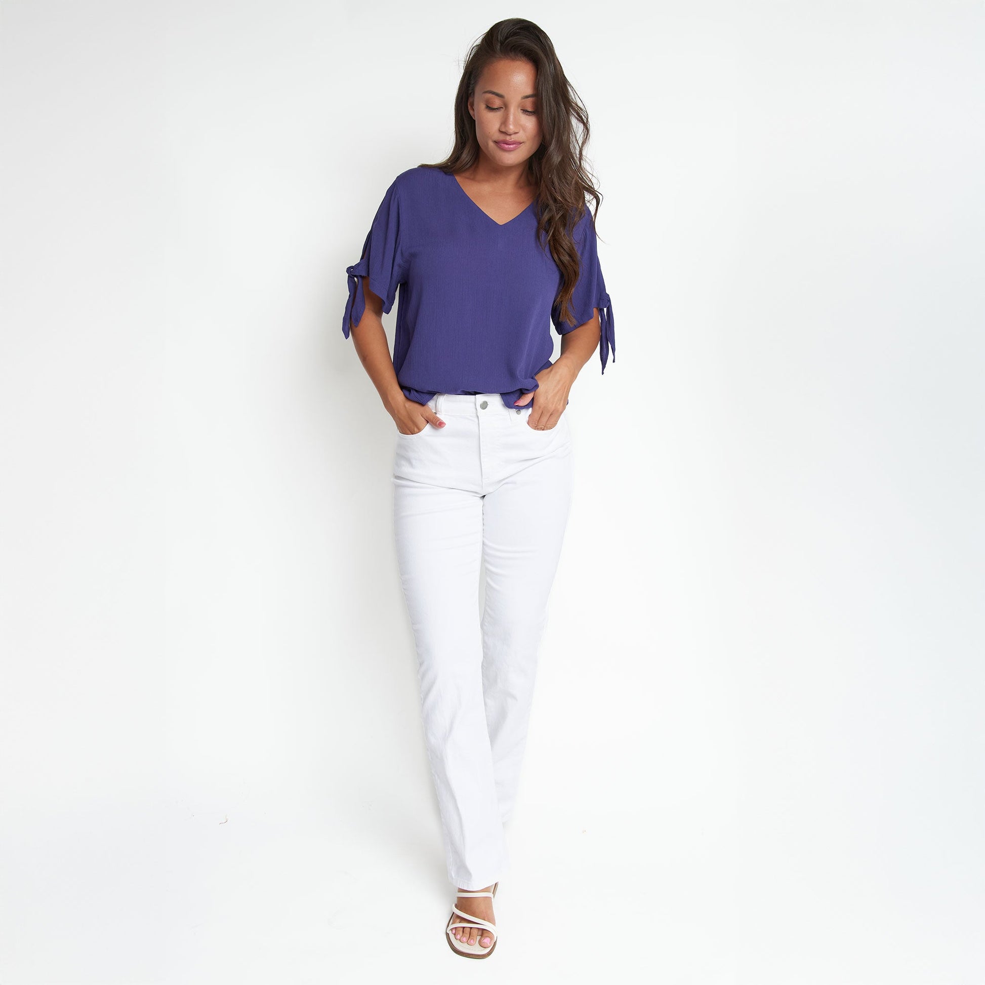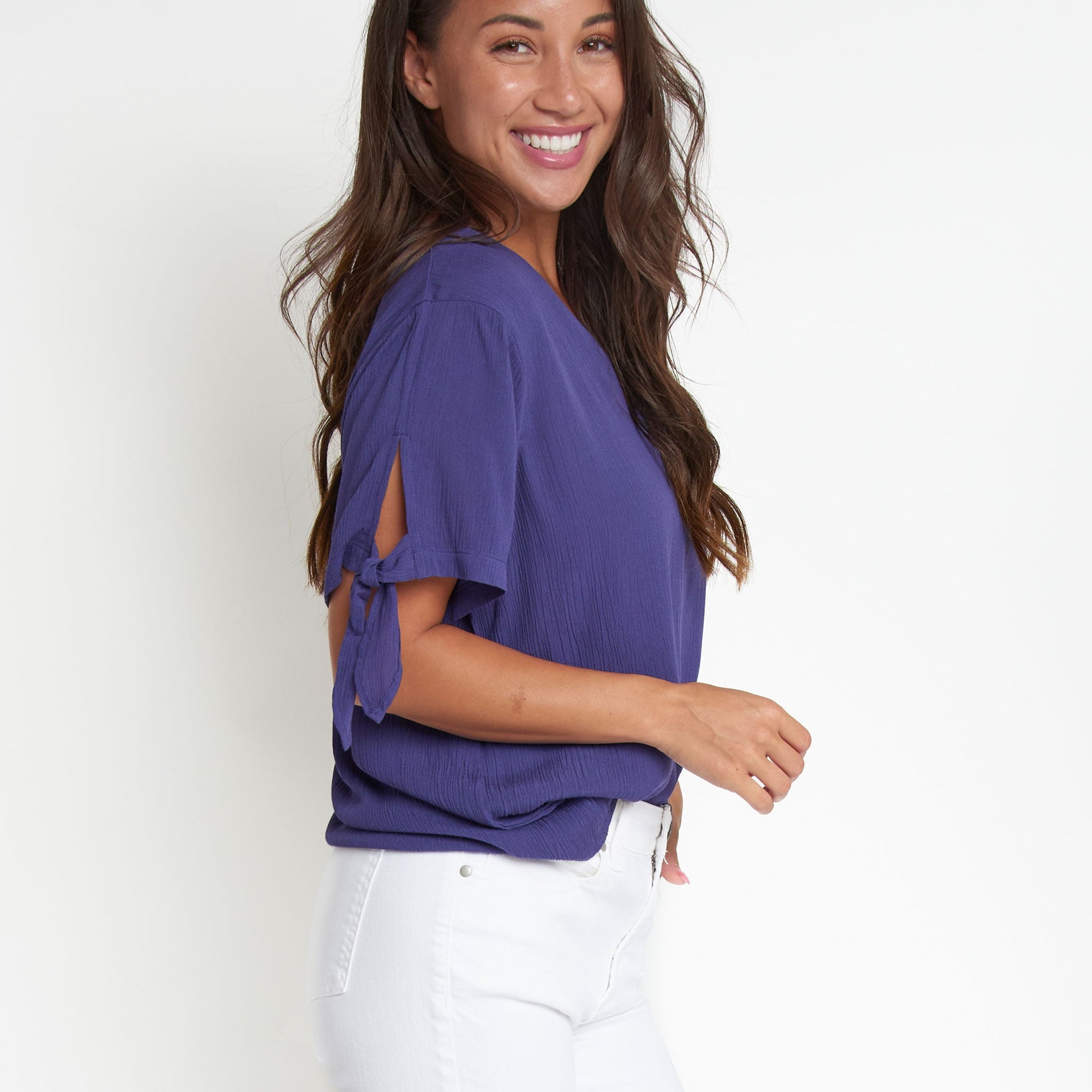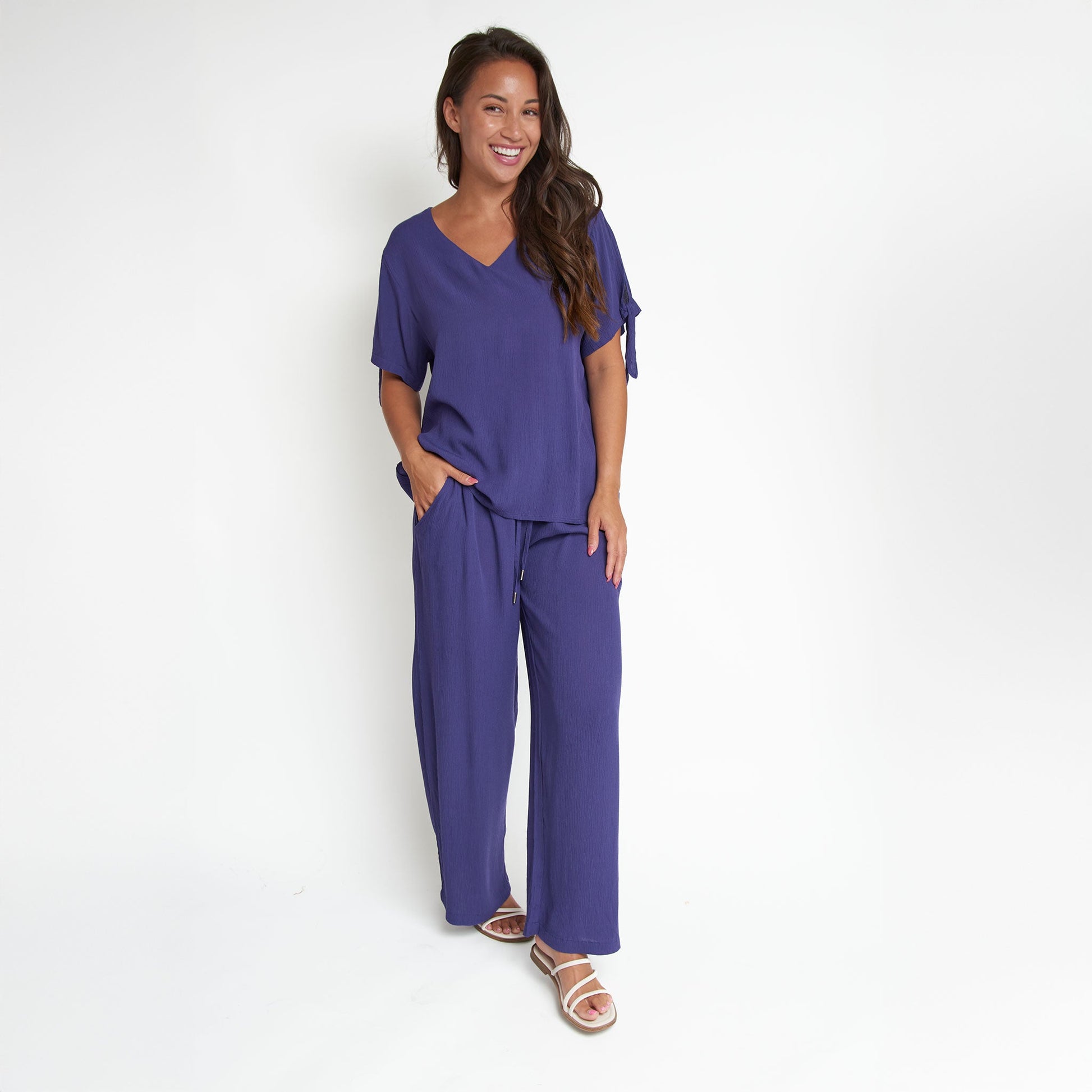 Chic and comfortable! The Nika Crepe V-Neck Blouse features a lightweight crepe fabric with Pantone's color of the year shade - Future Dusk - a stunning indigo blue hue, with a flattering V-Neck design and cute tied sleeves. Style it with the Nika Wide Leg Pants for a chic matching set, or on its own with your favorite jeans, skirt, or shorts for an easy, effortless look!