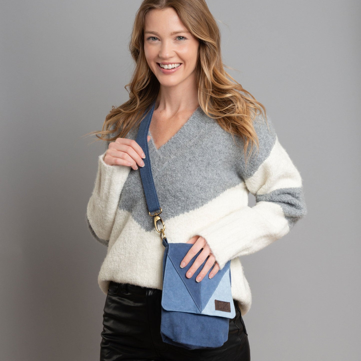 Trendy and so fun! The Nikole Patchwork Denim Crossbody Handbag features patchwork denim with a crossbody design. With a magnetic button closure and inner zipper pocket, this crossbody bag is perfect for every day use.