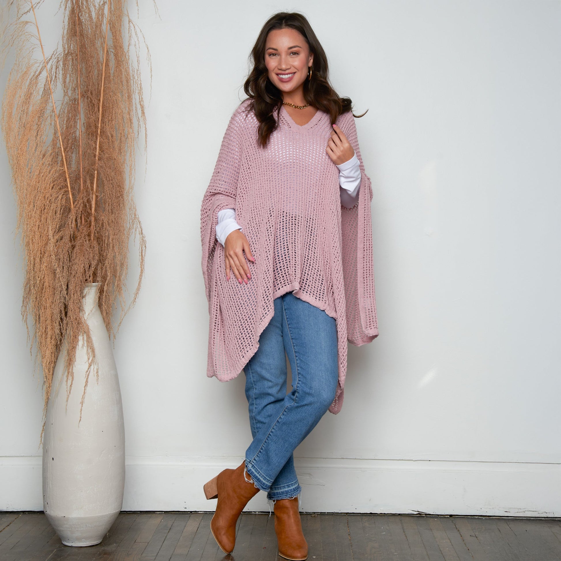 Cozy and cute! The Presley Open Sweater Knit Poncho features a flattering draped design and chic V-neck collar. Easy to style over your favorite outfit, this poncho is an absolute must-have for those colder months.