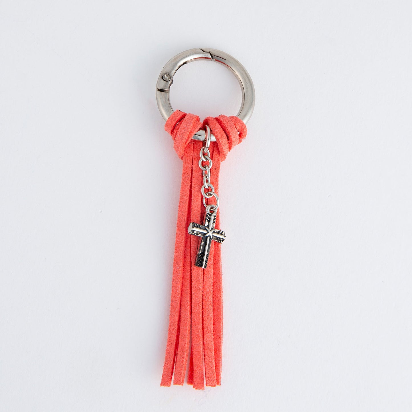 Stay organized in style with the Quinn Cross Charm Tassel Keychain. Featuring fun tassels and sweet engraved cross charm, this keychain stands out in both style and practicality.