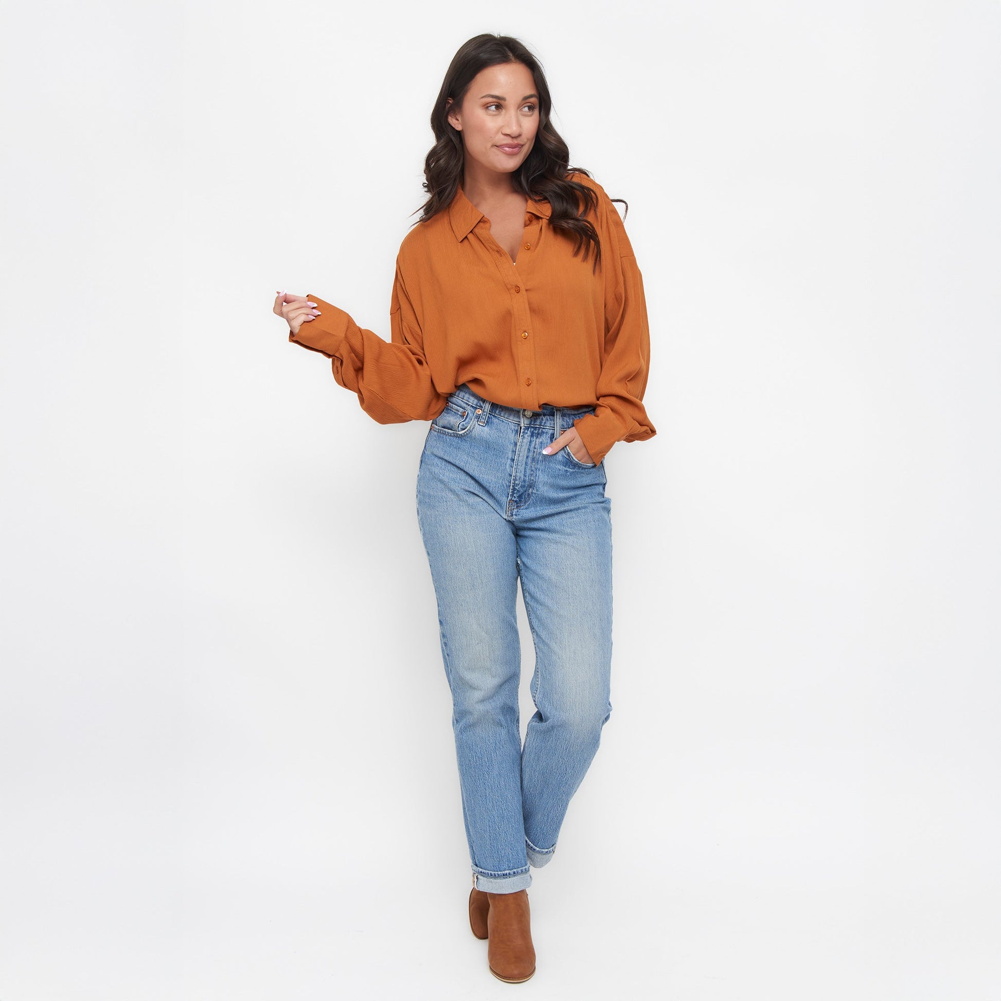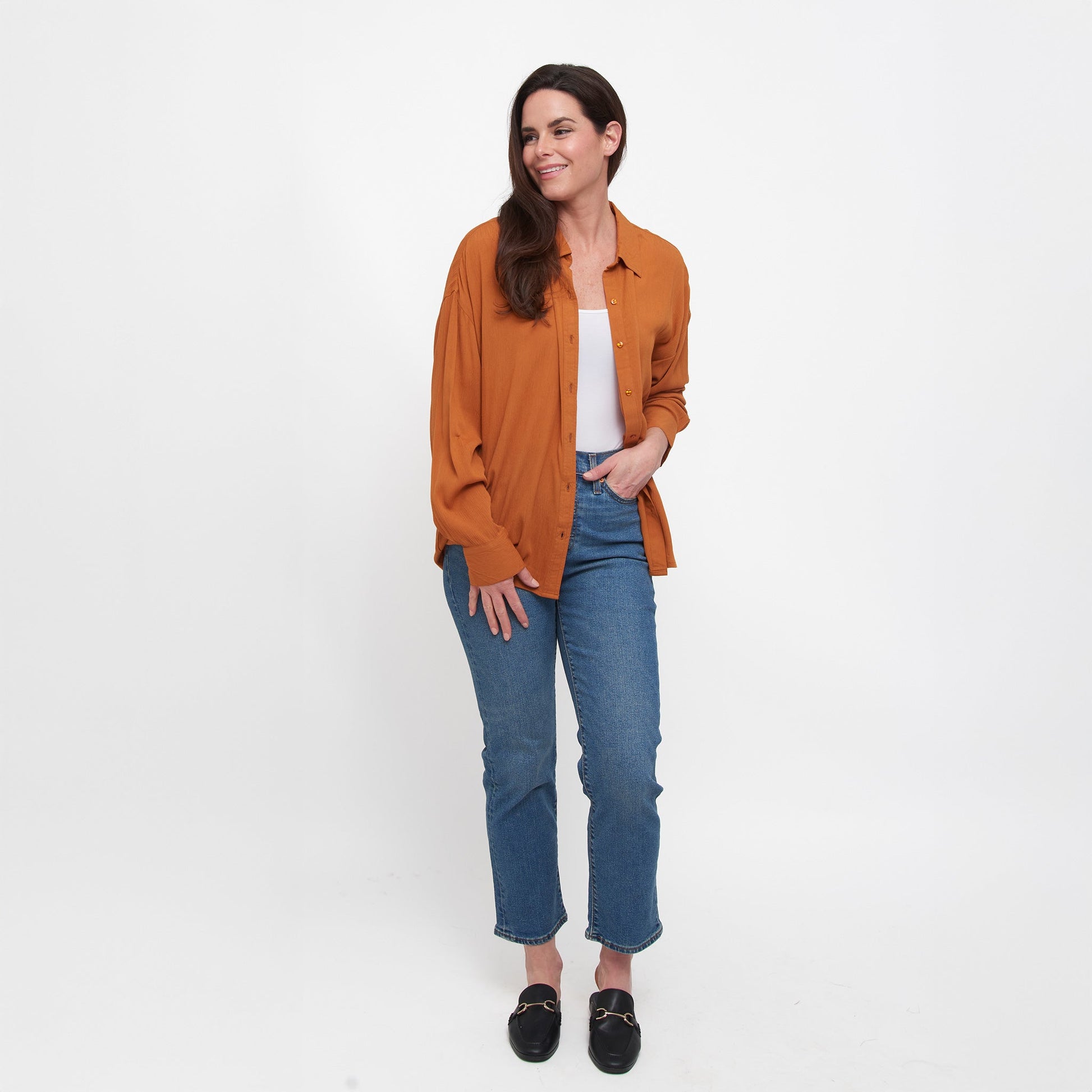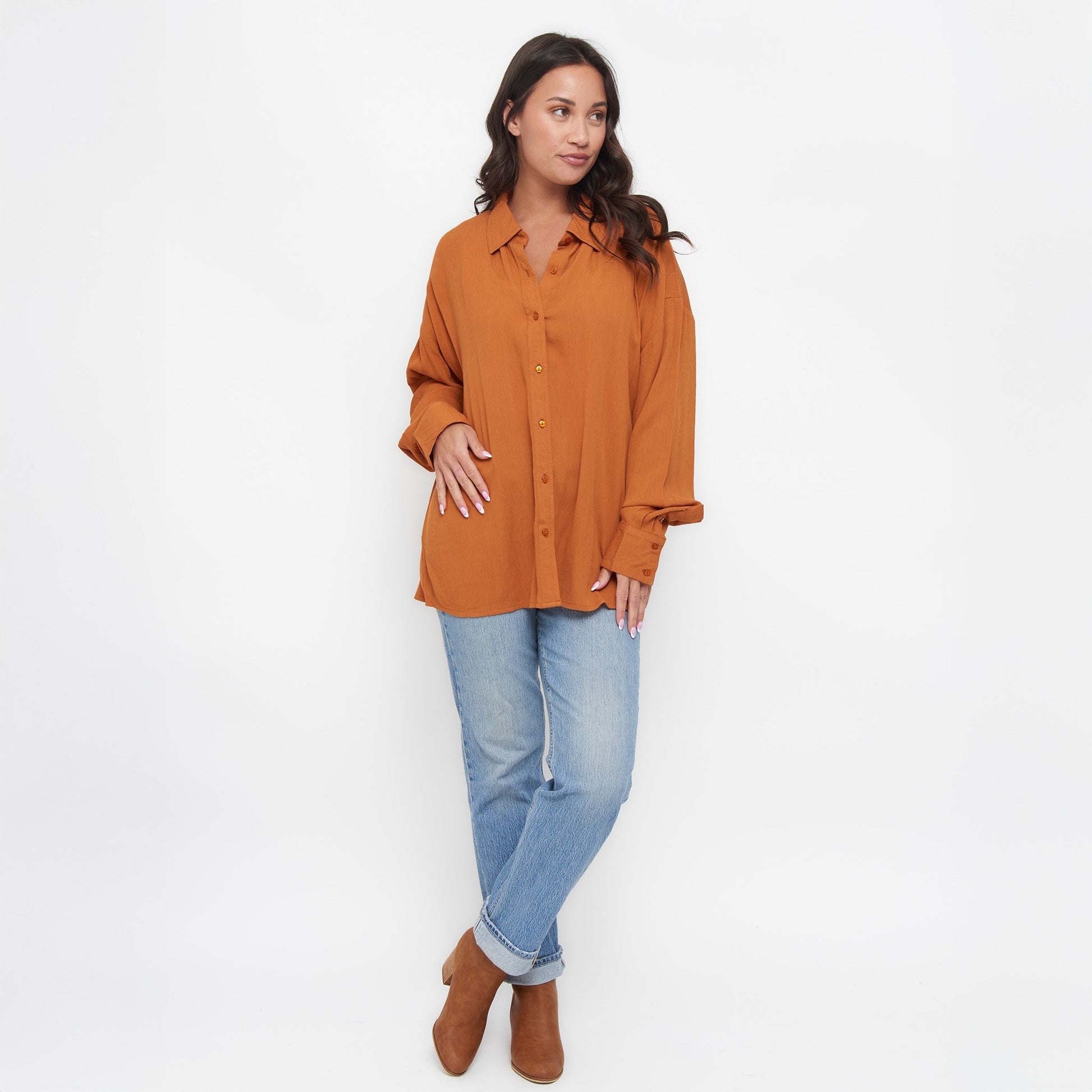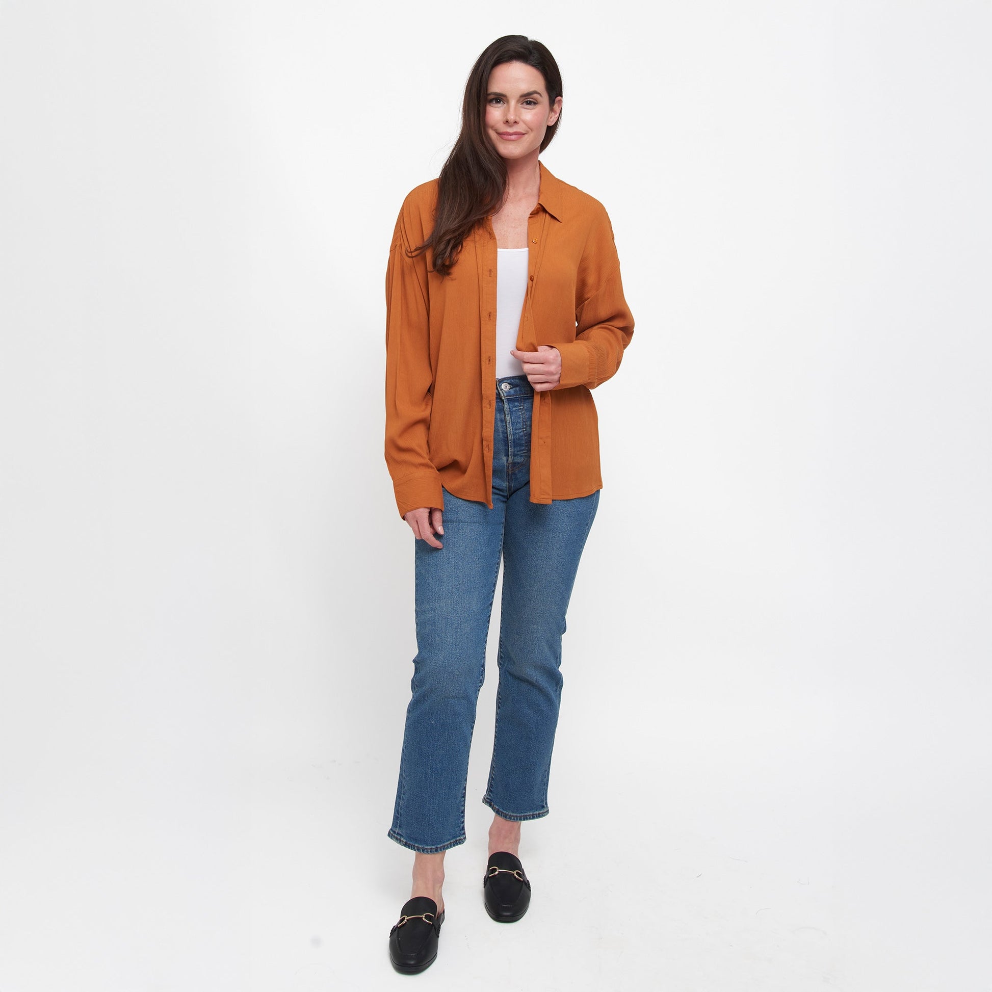 Add a pop of color to your wardrobe with the Reece Boyfriend Button Up Top. Featuring a vibrant rustic caramel orange in a stunning lightweight crepe fabric with a relaxed fit, this button up top brings both fun and comfort to your look.