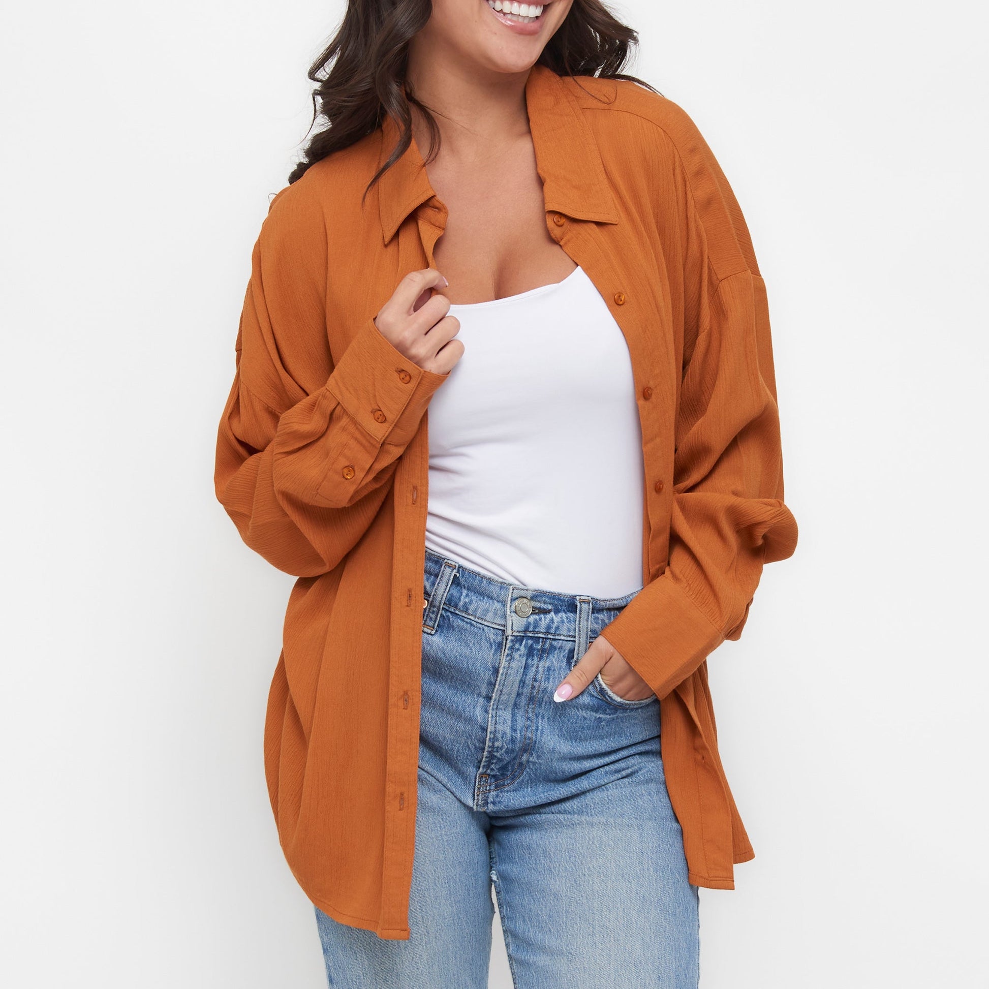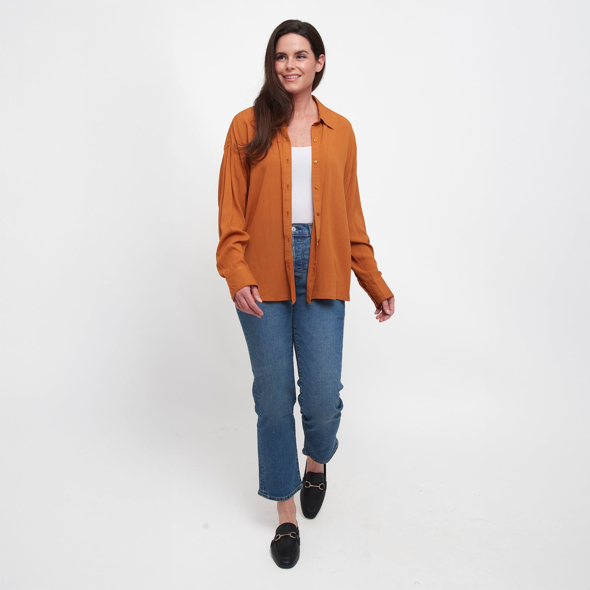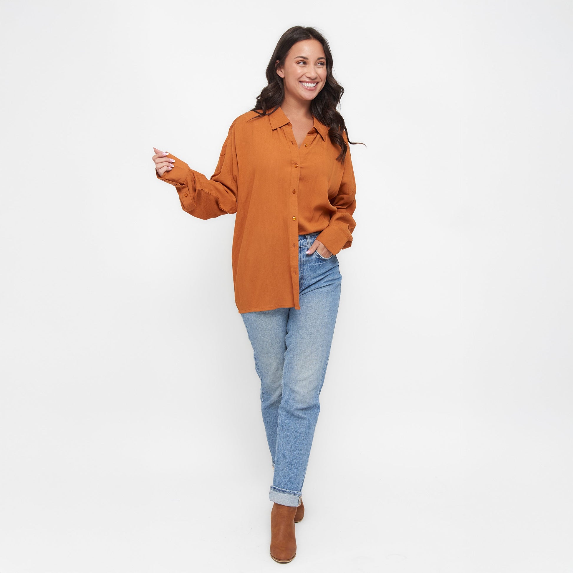 Add a pop of color to your wardrobe with the Reece Boyfriend Button Up Top. Featuring a vibrant rustic caramel orange in a stunning lightweight crepe fabric with a relaxed fit, this button up top brings both fun and comfort to your look.