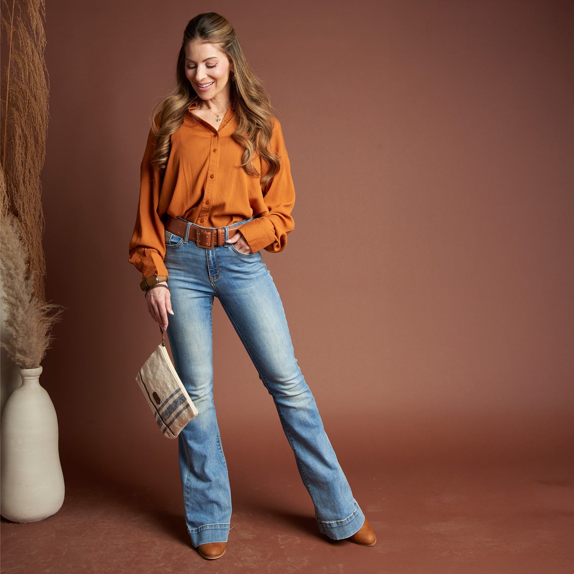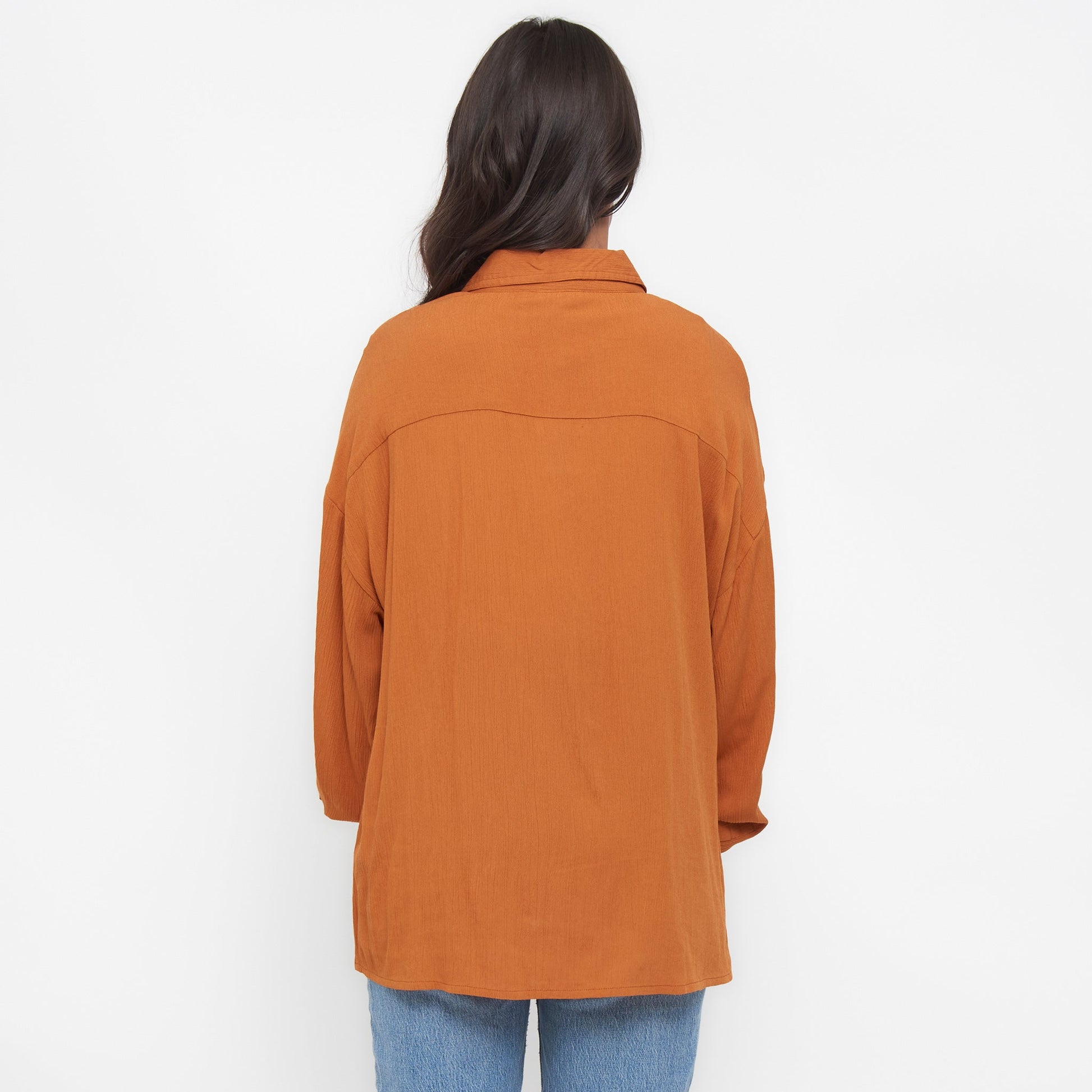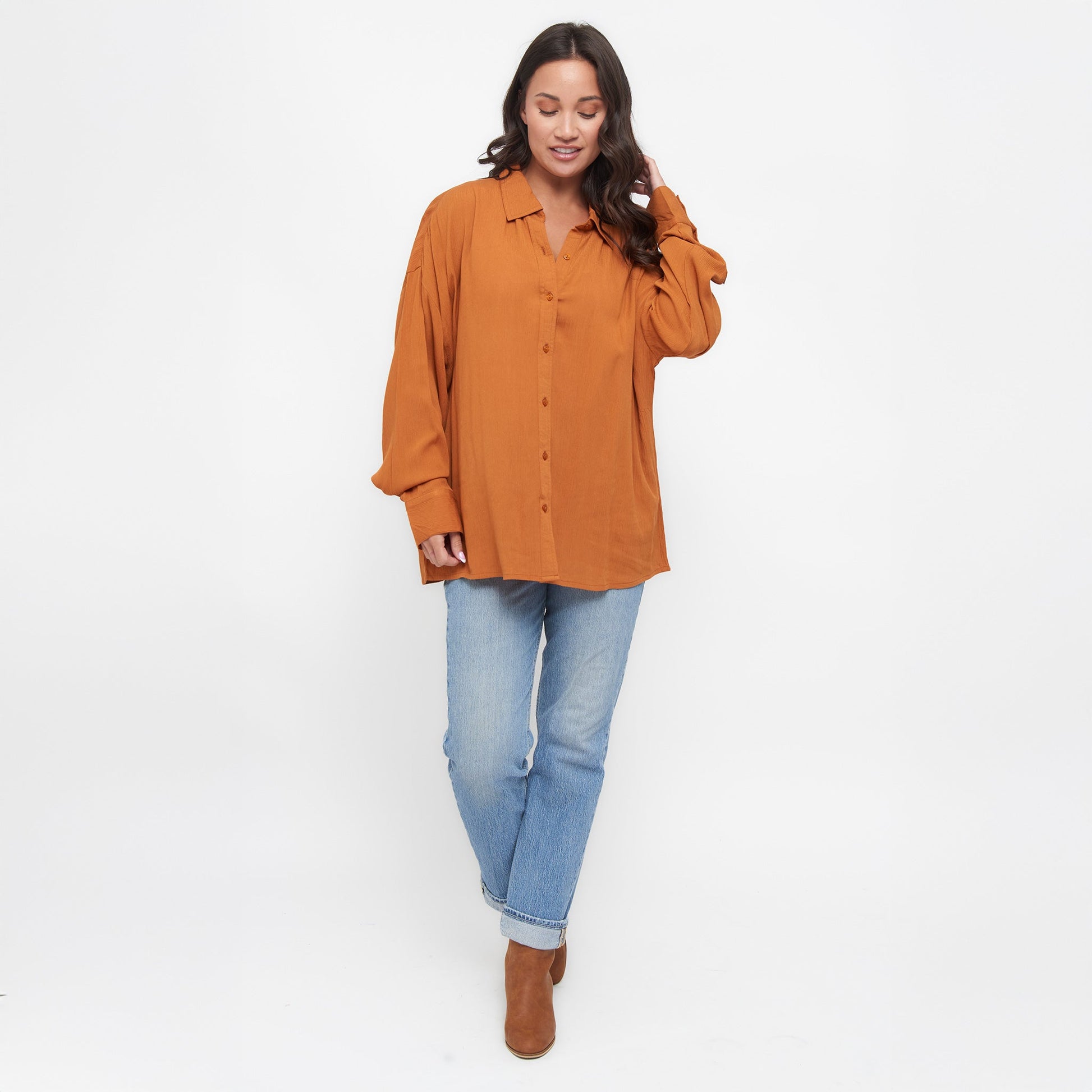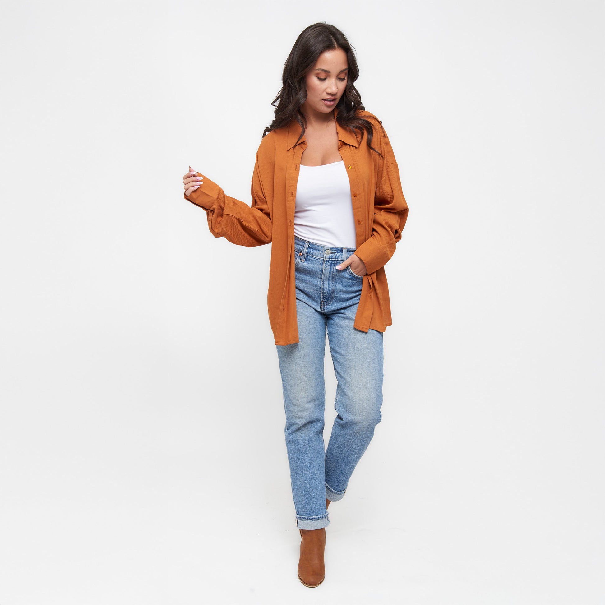 Add a pop of color to your wardrobe with the Reece Boyfriend Button Up Top. Featuring a vibrant rustic caramel orange in a stunning lightweight crepe fabric with a relaxed fit, this button up top brings both fun and comfort to your look.