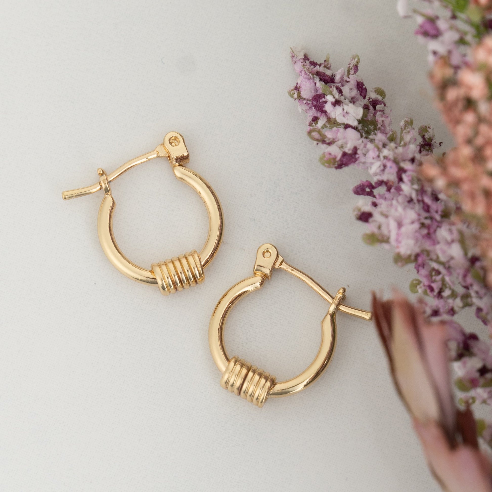 An elevated classic, the Small Ring Hoop Earrings are dainty earrings in a timeless gold tone. Their ring detailing and easy to use pin catch enclosure only add to their charm. Easy to style, these little cuties are perfect for every day wear.