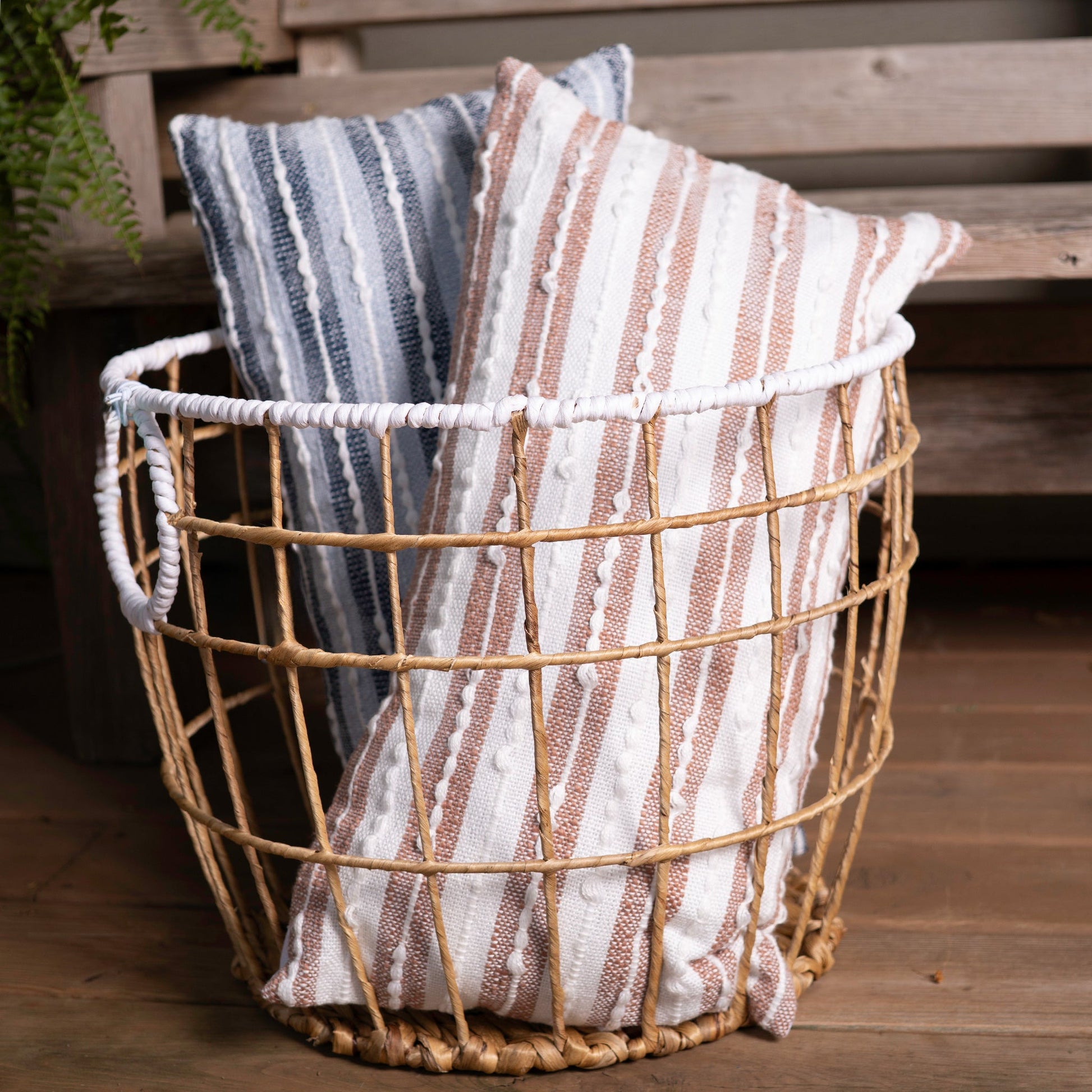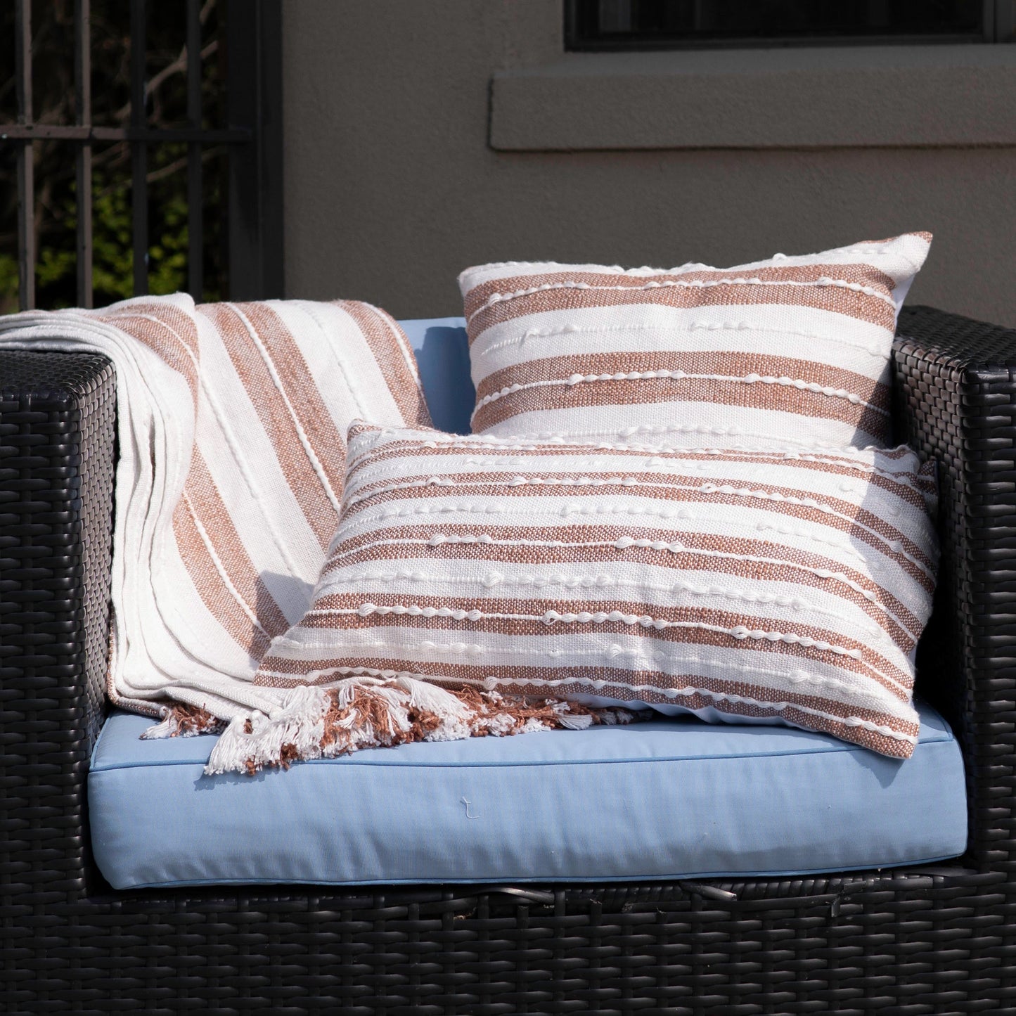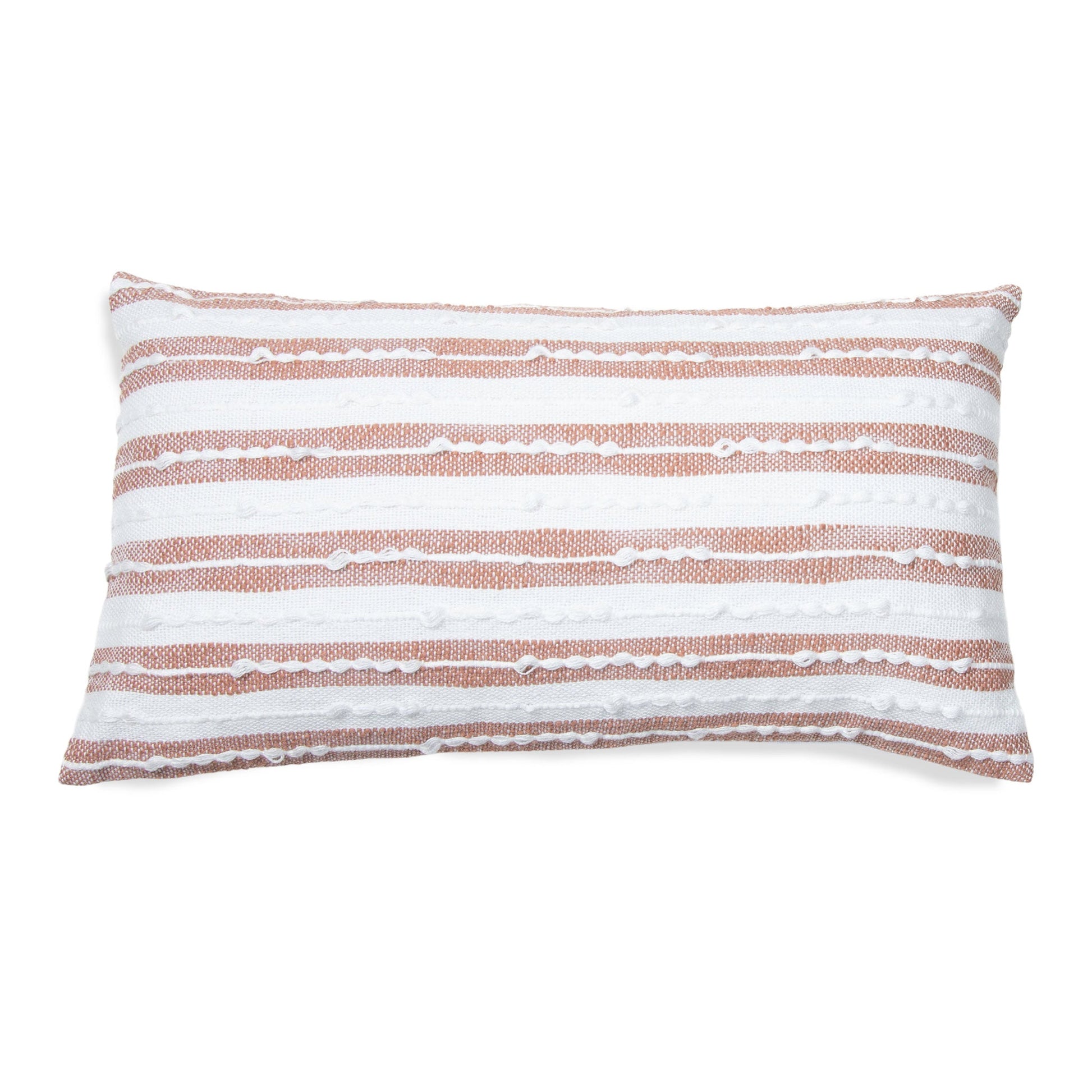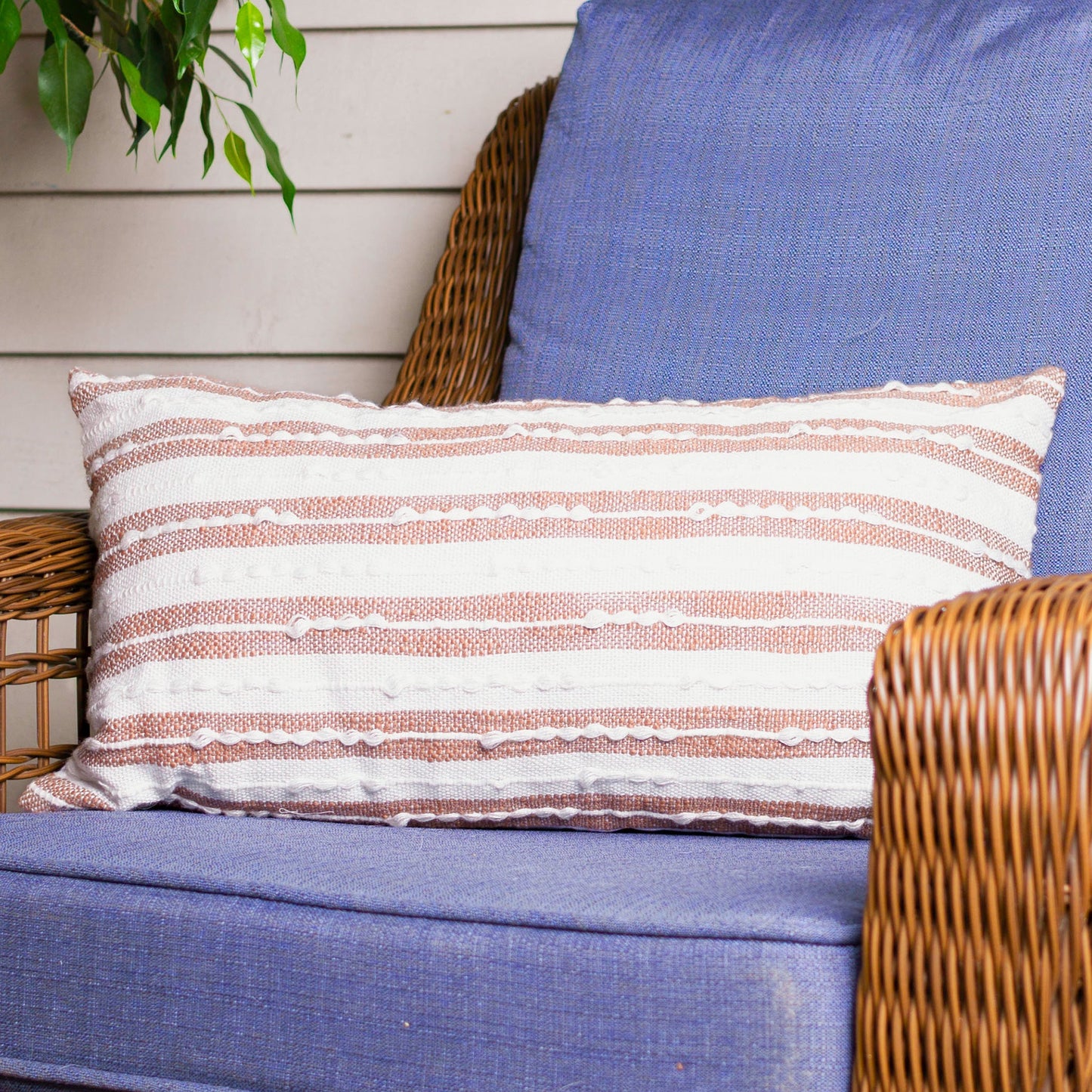 Add a bit of interest to your outdoor living space with the Romy Handwoven Indoor/Outdoor 12x22 Lumbar Pillow. Featuring a cute textured clay stripe design, this handwoven lumbar pillow is made from recycled plastic bottles and is UV protected, ensuring a longer outdoor life. Its zipper opening makes it a breeze to clean. If you've been looking for the perfect outdoor throw pillow, this is it.