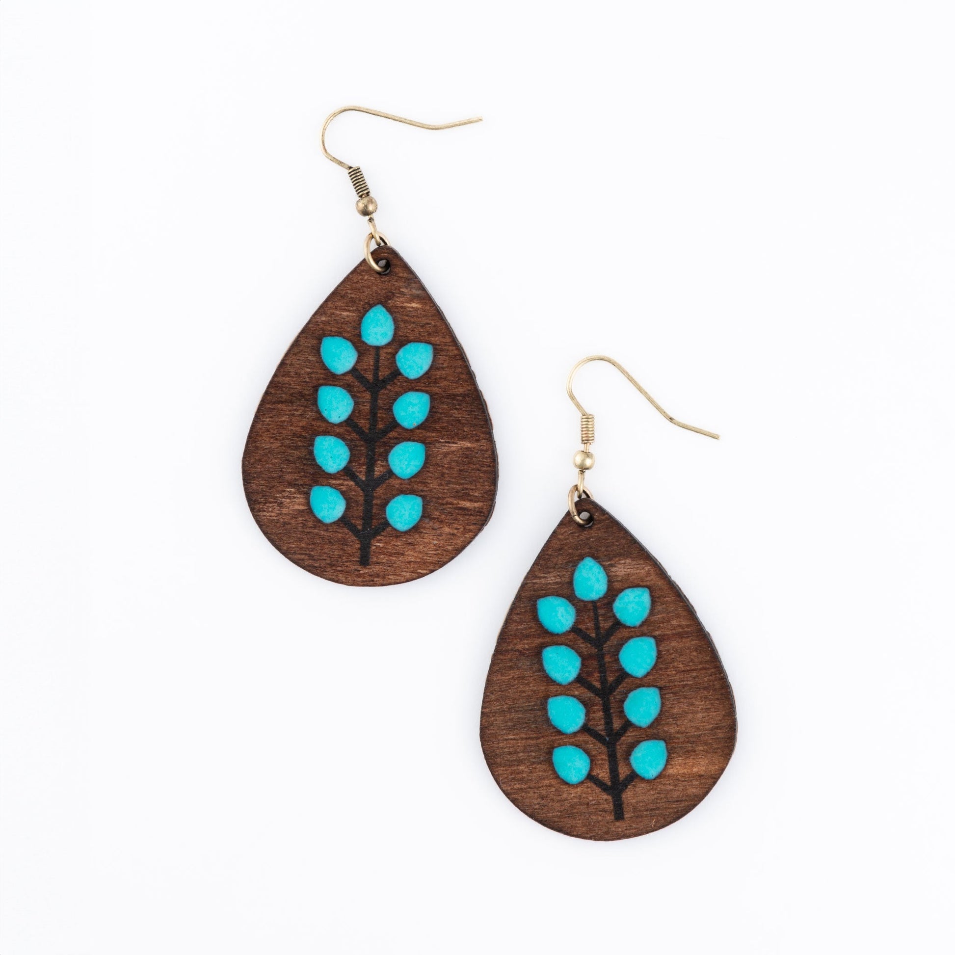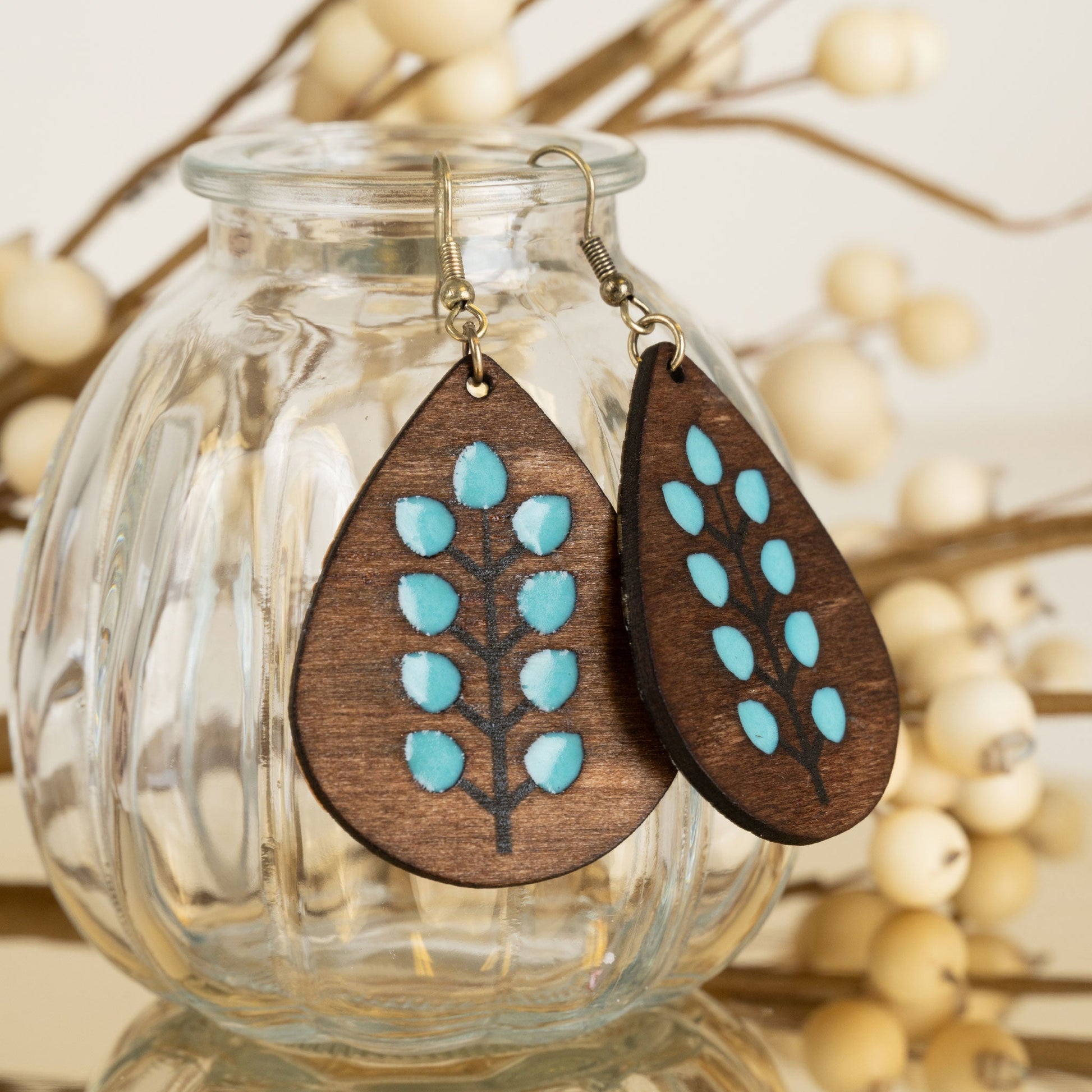 Add a pop of color to your outfit with the Samira Engraved Leaf Wood Earrings. Featuring beautifully engraved plant detailing with vibrant aqua leaves painted onto wooden teardrops, these unique earrings are the perfect finishing touch.