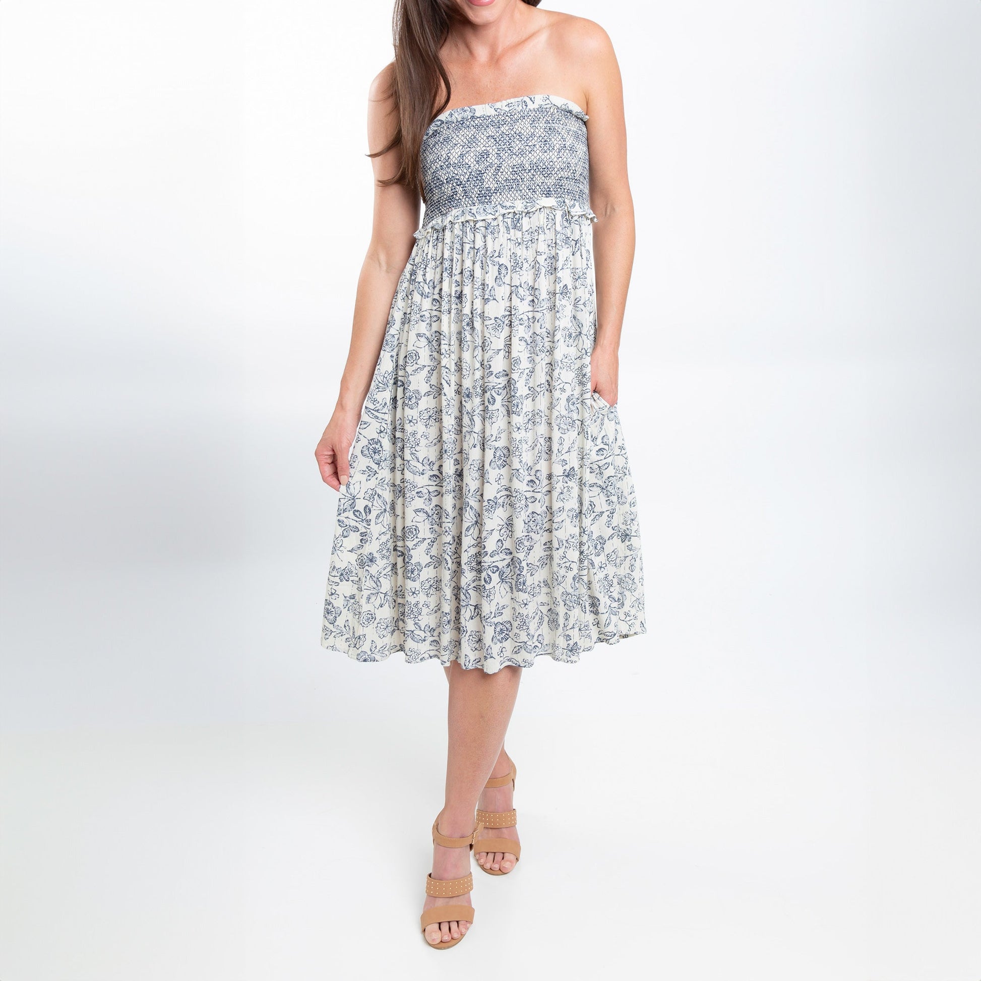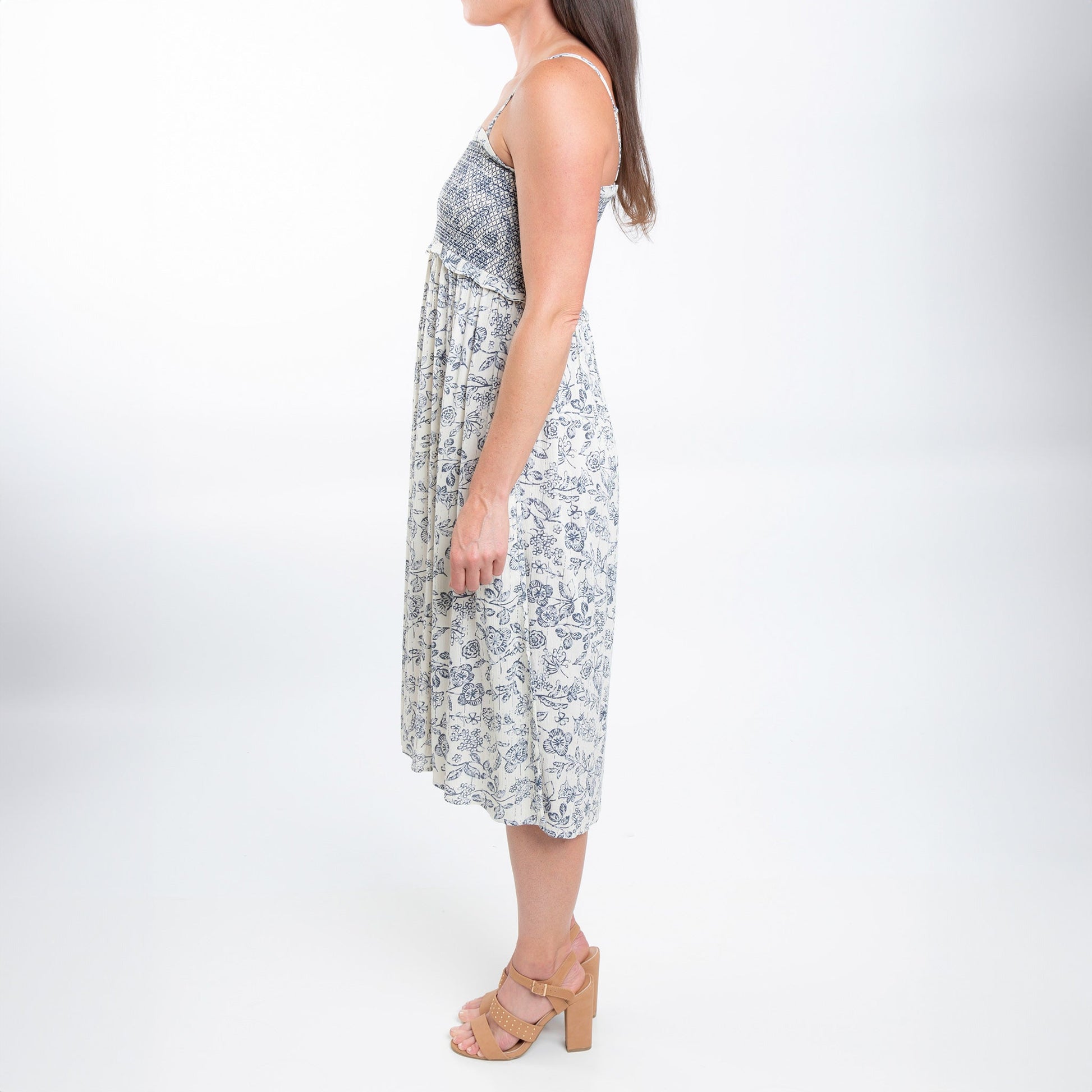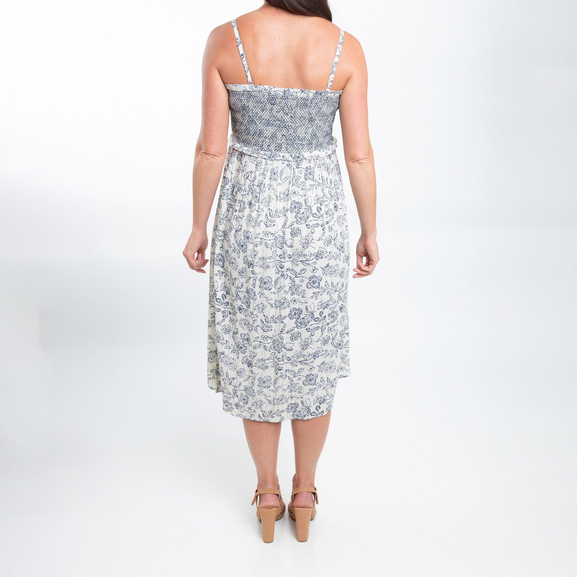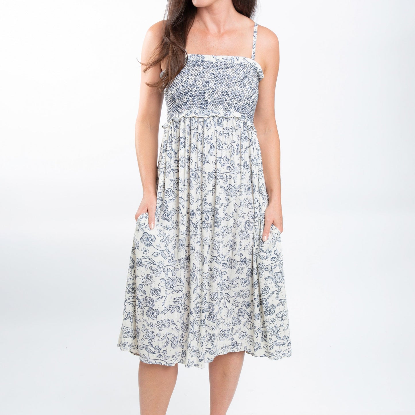 Your new favorite dress! Featuring a Toile De Jouy Floral print with removable straps and a versatile midi length, the Sarai Smoked Midi Dress is perfect for those warmer days!