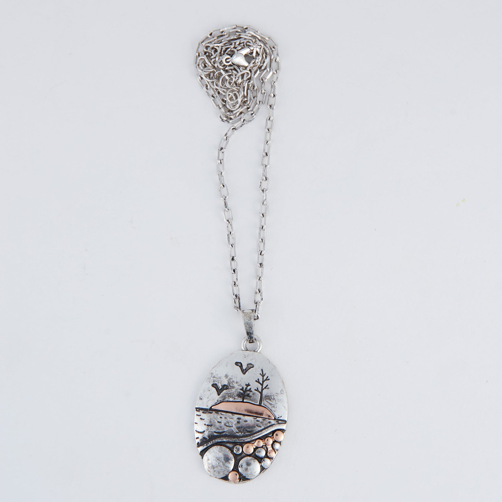 Perfect for every day wear, the Sinclair Oval Nature Pendant Necklace features a beautiful two-tone scenic image etched into a pendant of silver. With its delicate silver chain and artistic feel, this necklace is sure to become a treasured favorite.