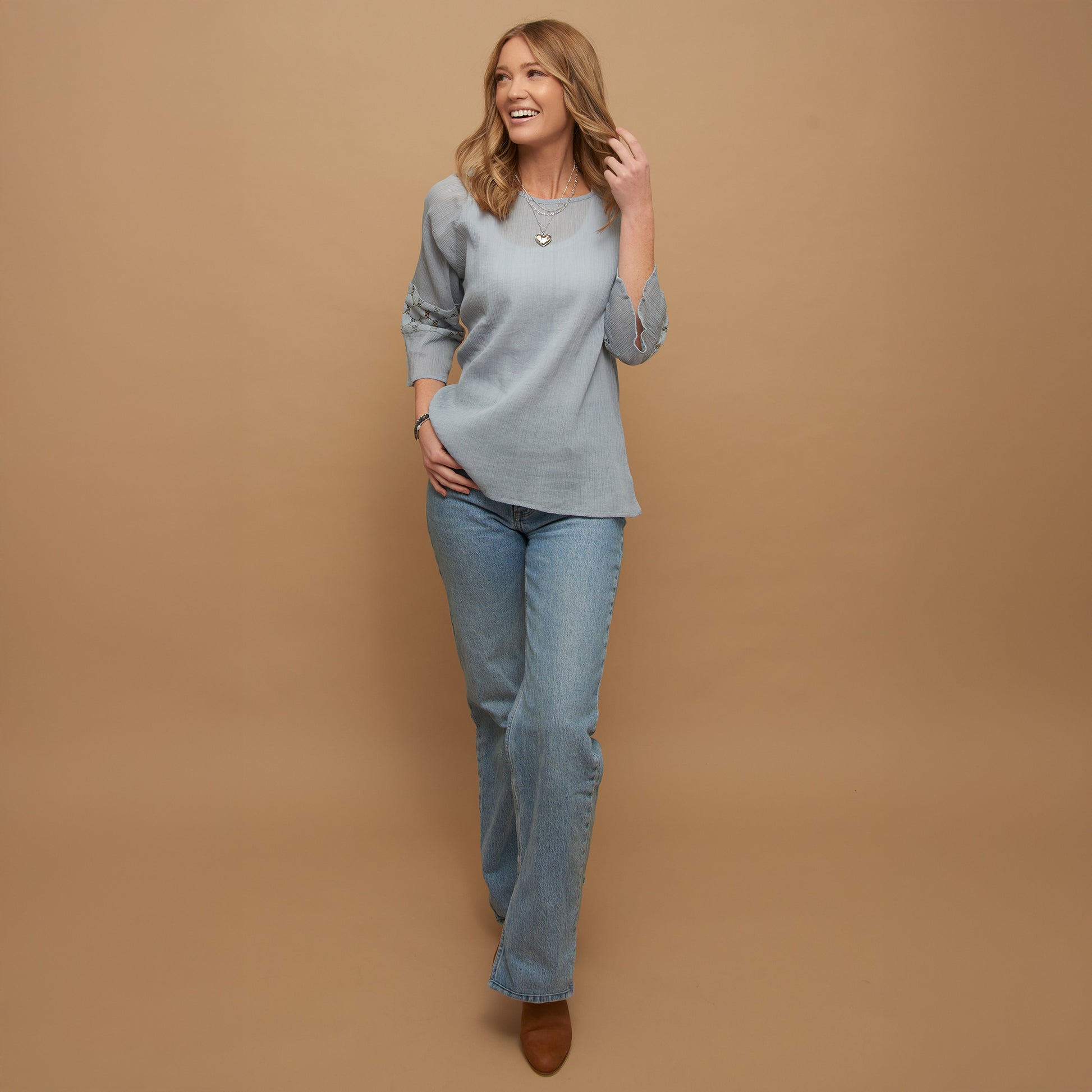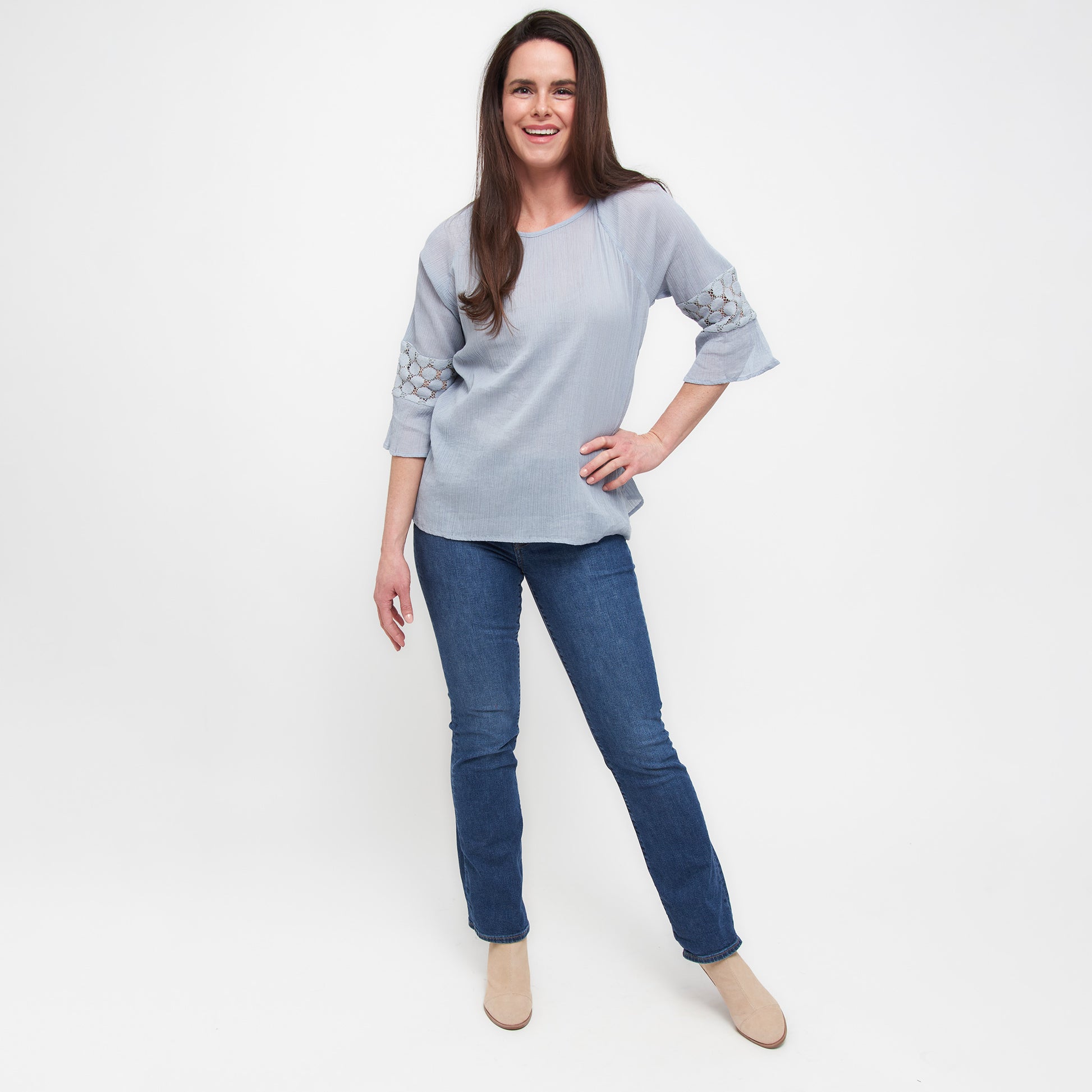 A springtime essential, the Skylah Raglan Sleeve Blouse is gorgeous in a lovely celestial blue color with intricate lace detailing in each sleeve with a semi-sheer crepe fabric. Lightweight and easy to pair with anything already in your closet, this top is an absolute essential.
