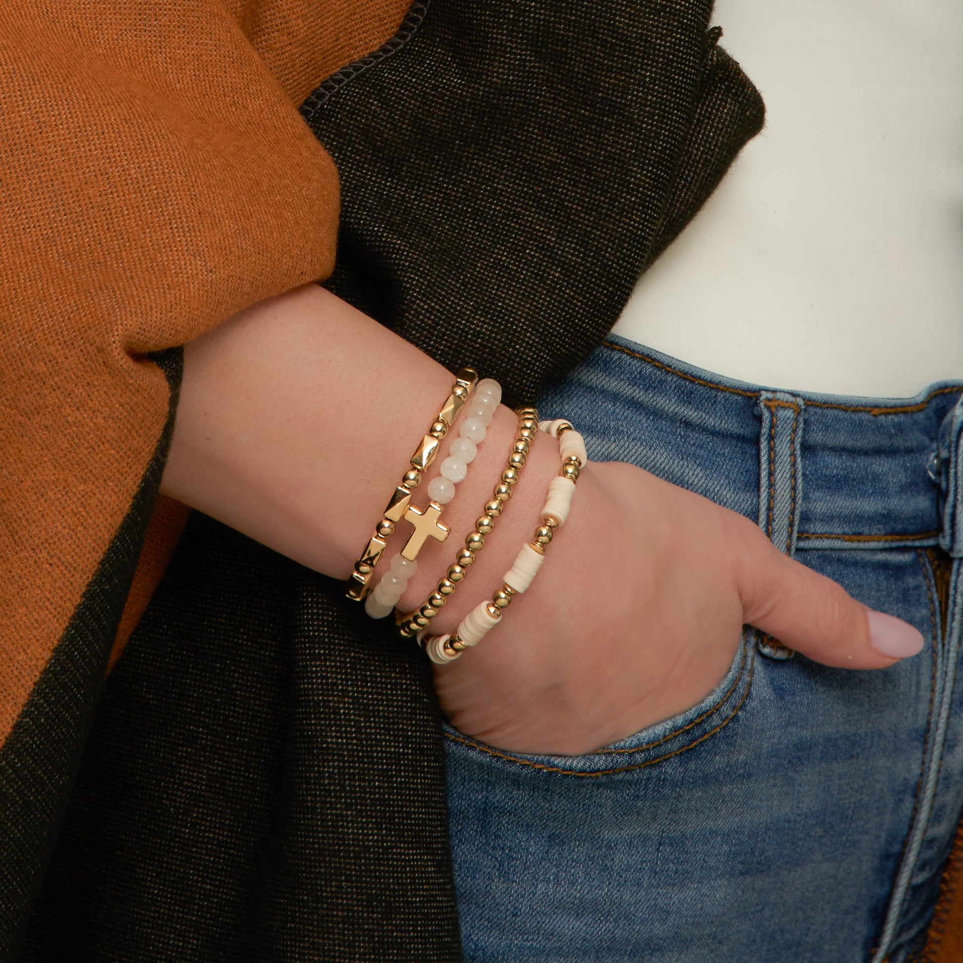 Chic and cute! Featuring white and gold beads strung along a coiled band with a golden cross charm, the Solana Beaded Cross Coil Bracelet is perfect for every day wear or special occasions.