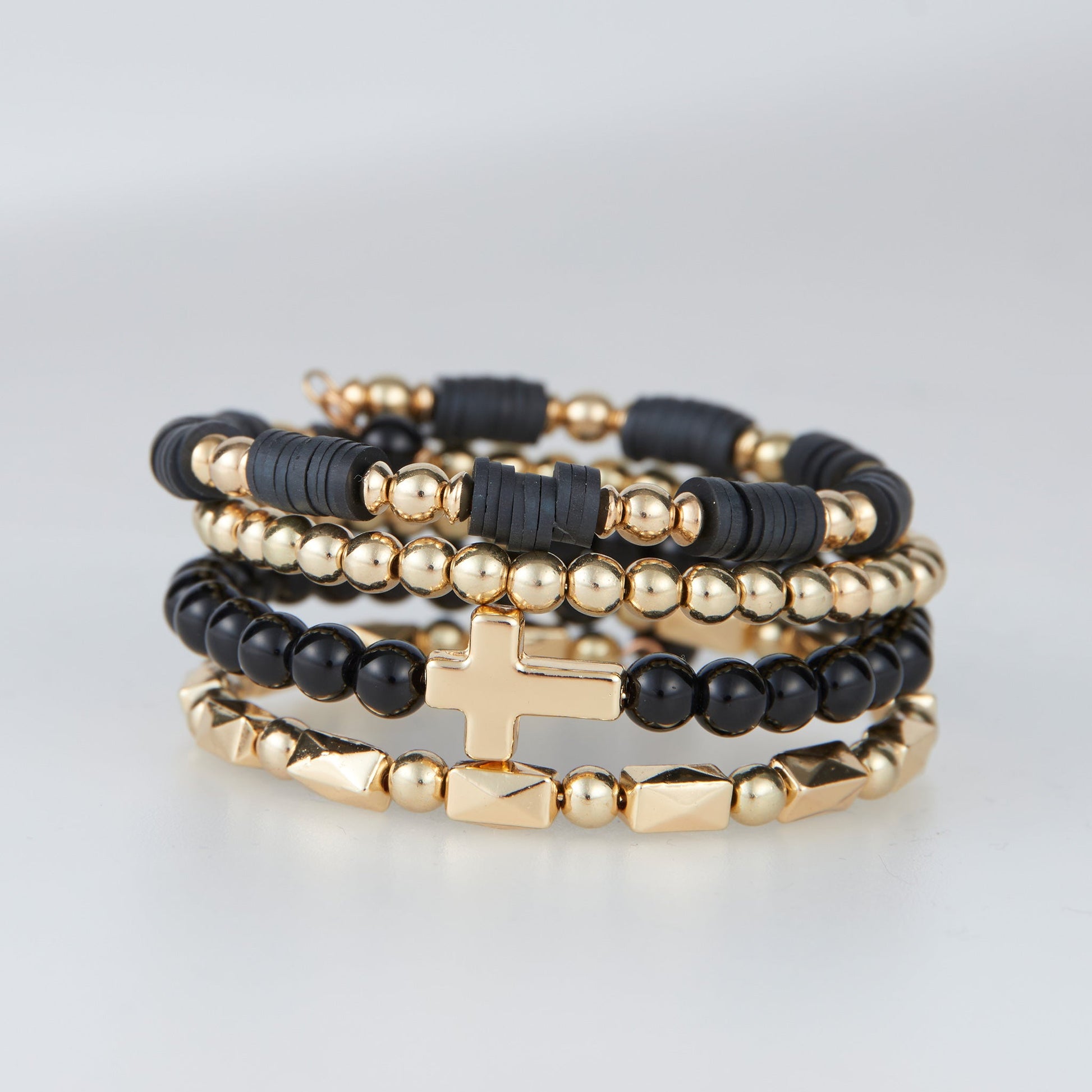 Chic and cute! Featuring white and gold beads strung along a coiled band with a golden cross charm, the Solana Beaded Cross Coil Bracelet is perfect for every day wear or special occasions.