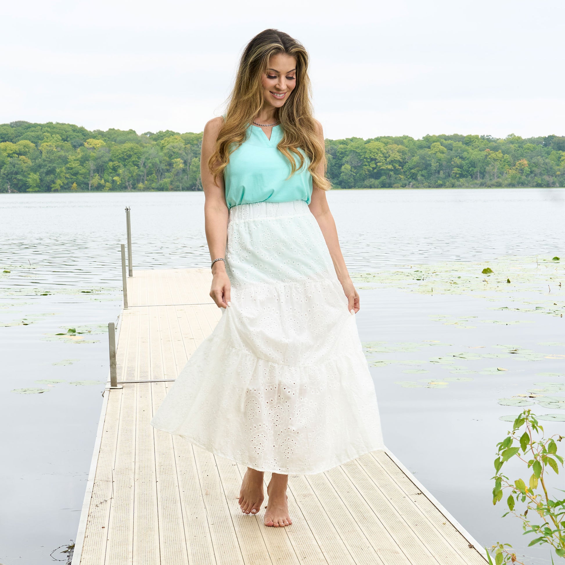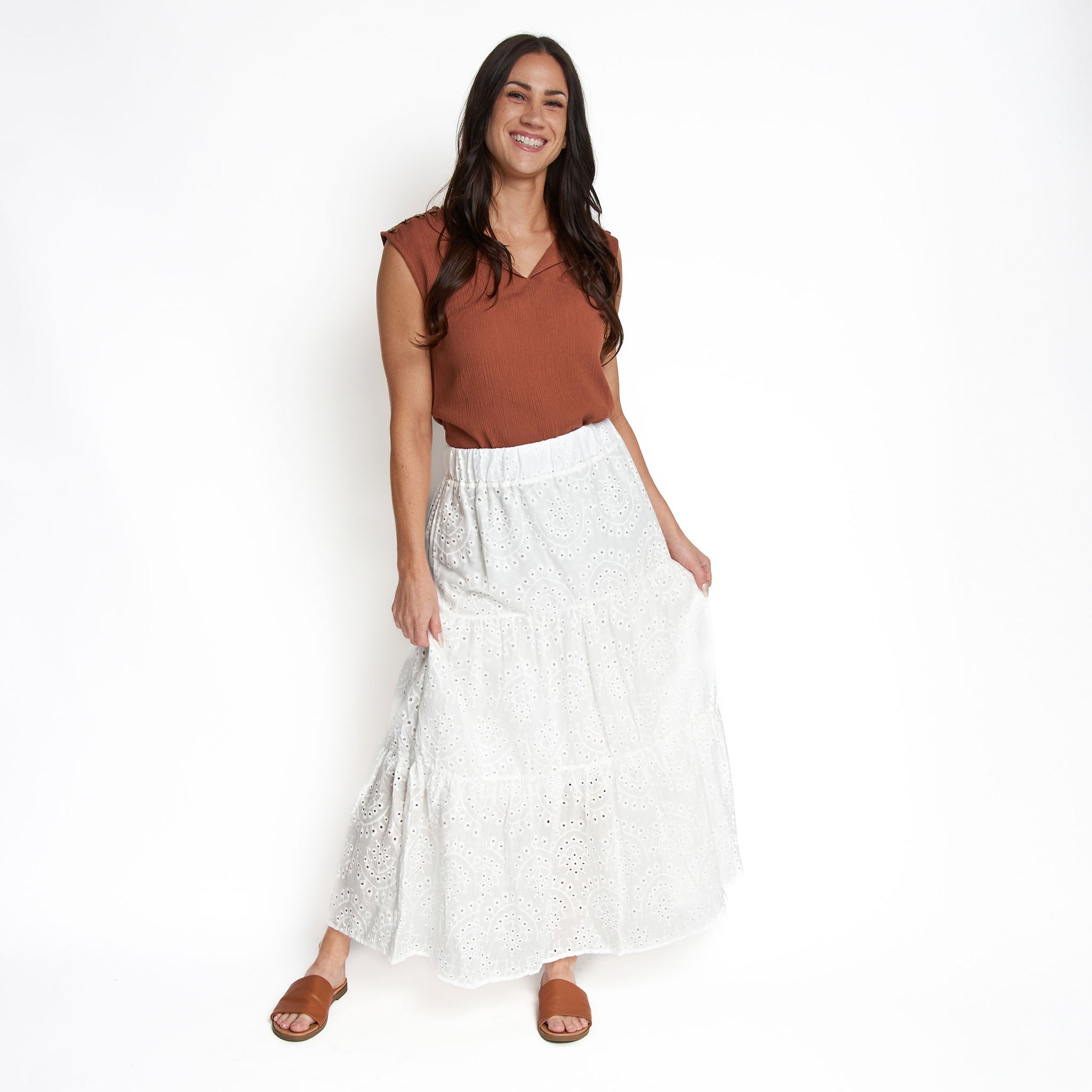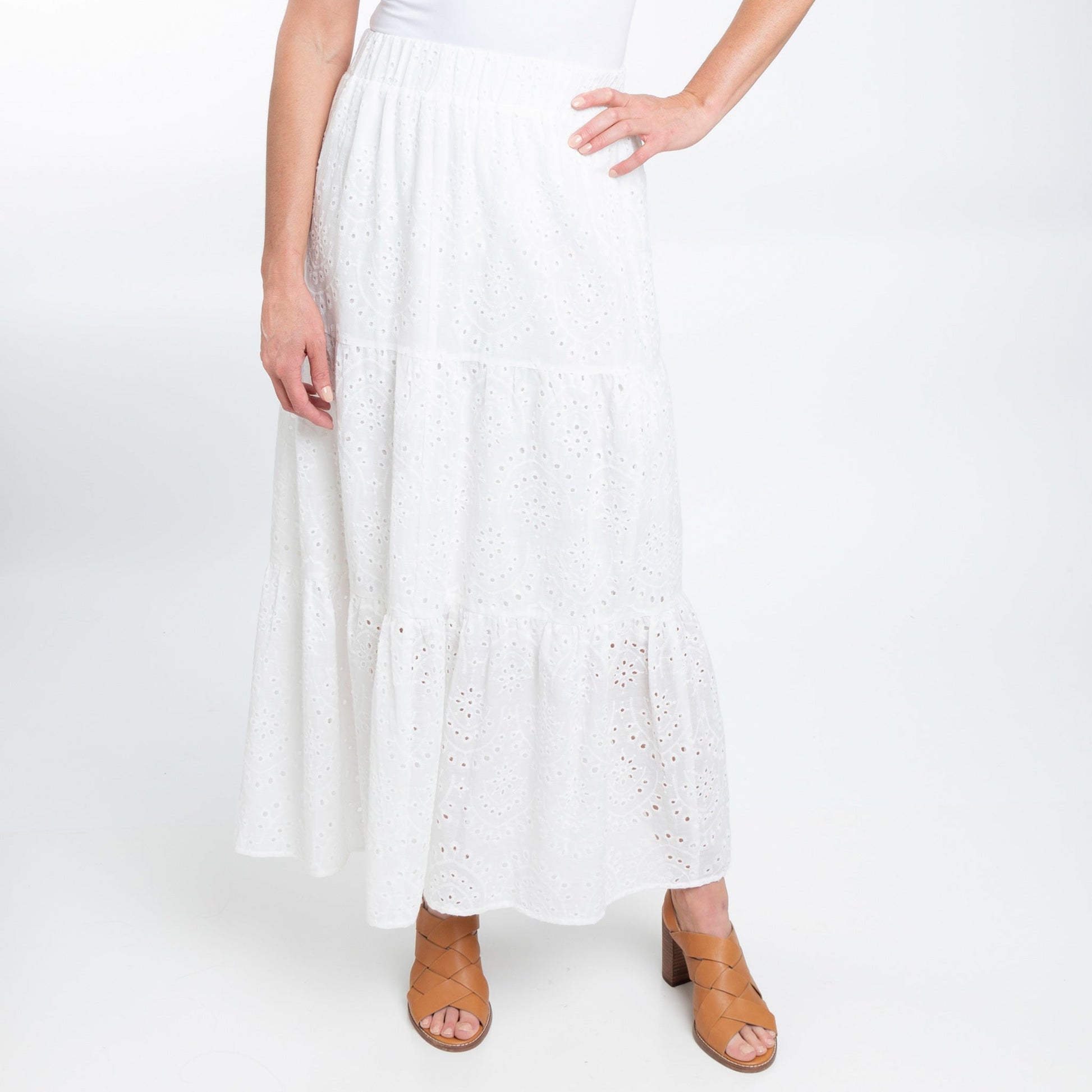 A summer essential, the Solange Eyelet Maxi Skirt features a gorgeous embroidered eyelet pattern, trendy paneled detailing, and comfortable elastic waist. This lightweight and easy to wear skirt will easily become your new favorite.