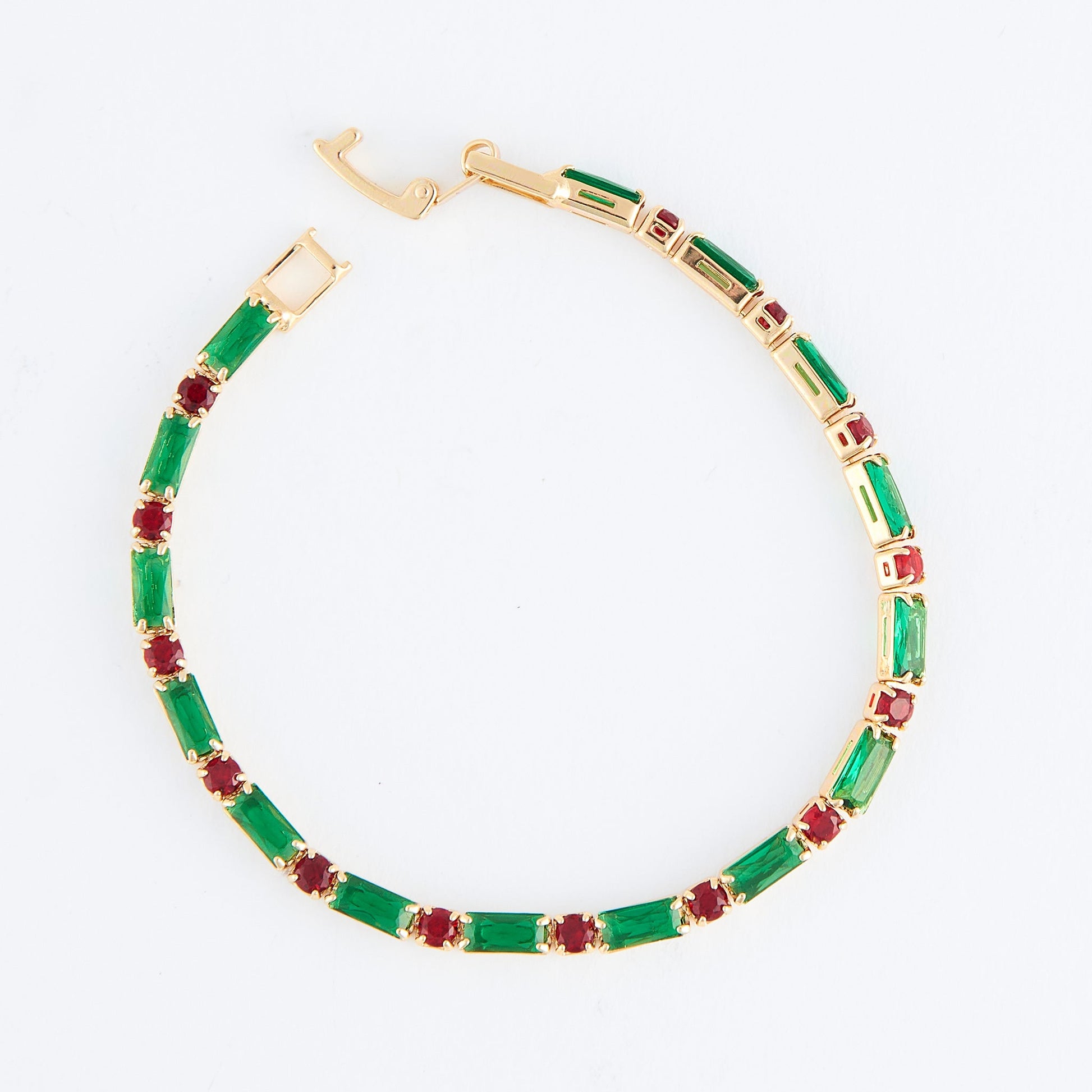Stay festive and fun this holiday season with the Stella Baguette And Round Gemstone Bracelet. Featuring vibrant red and green baguette and round glass gemstones with a fold-over clasp, this cutie adds cheery flair to any look.