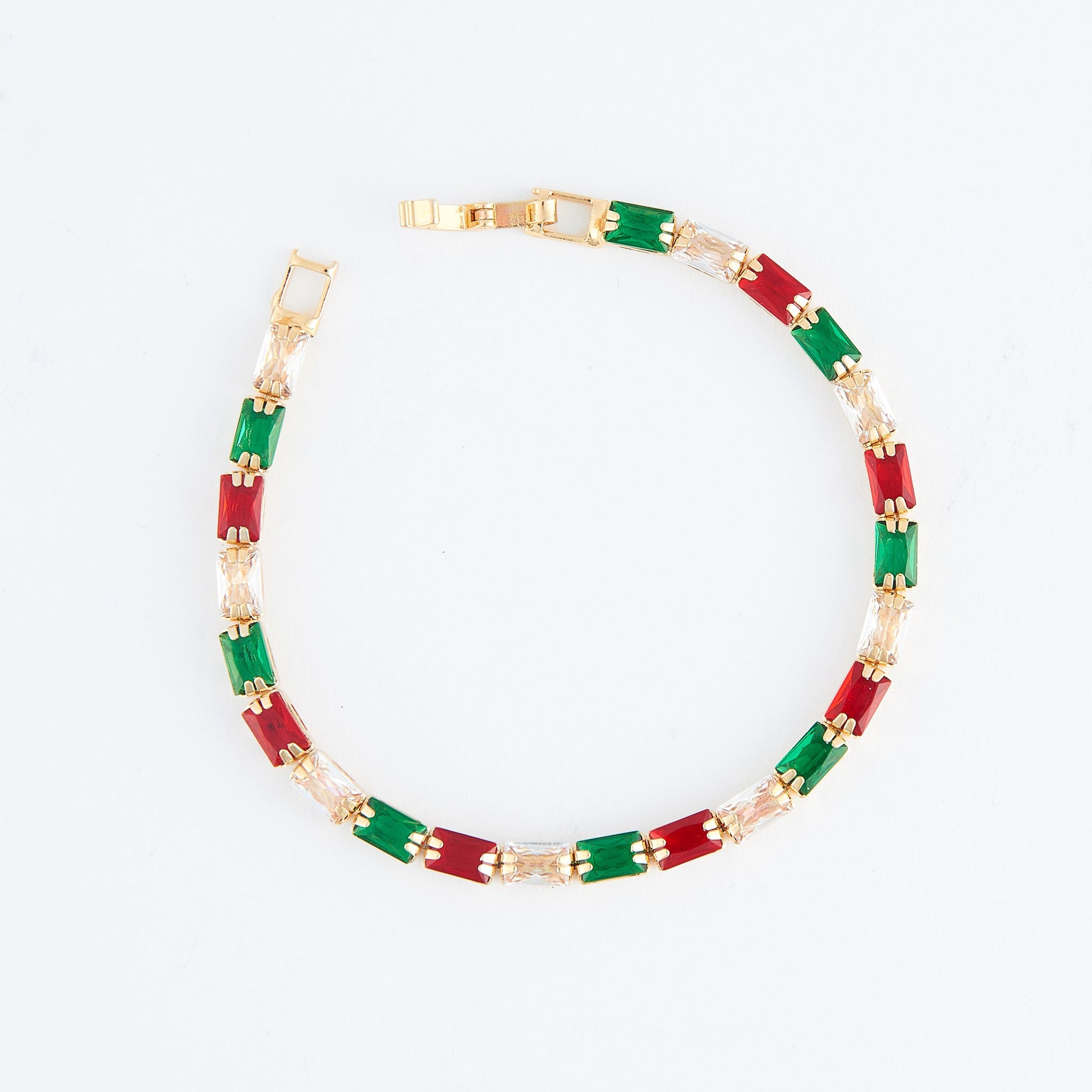 Stay festive and fun this holiday season with the Stella Baguette Gemstone Bracelet. Featuring vibrant red, green, and clear baguette glass gemstones and fold-over clasp, this cutie adds cheery flair to any look.