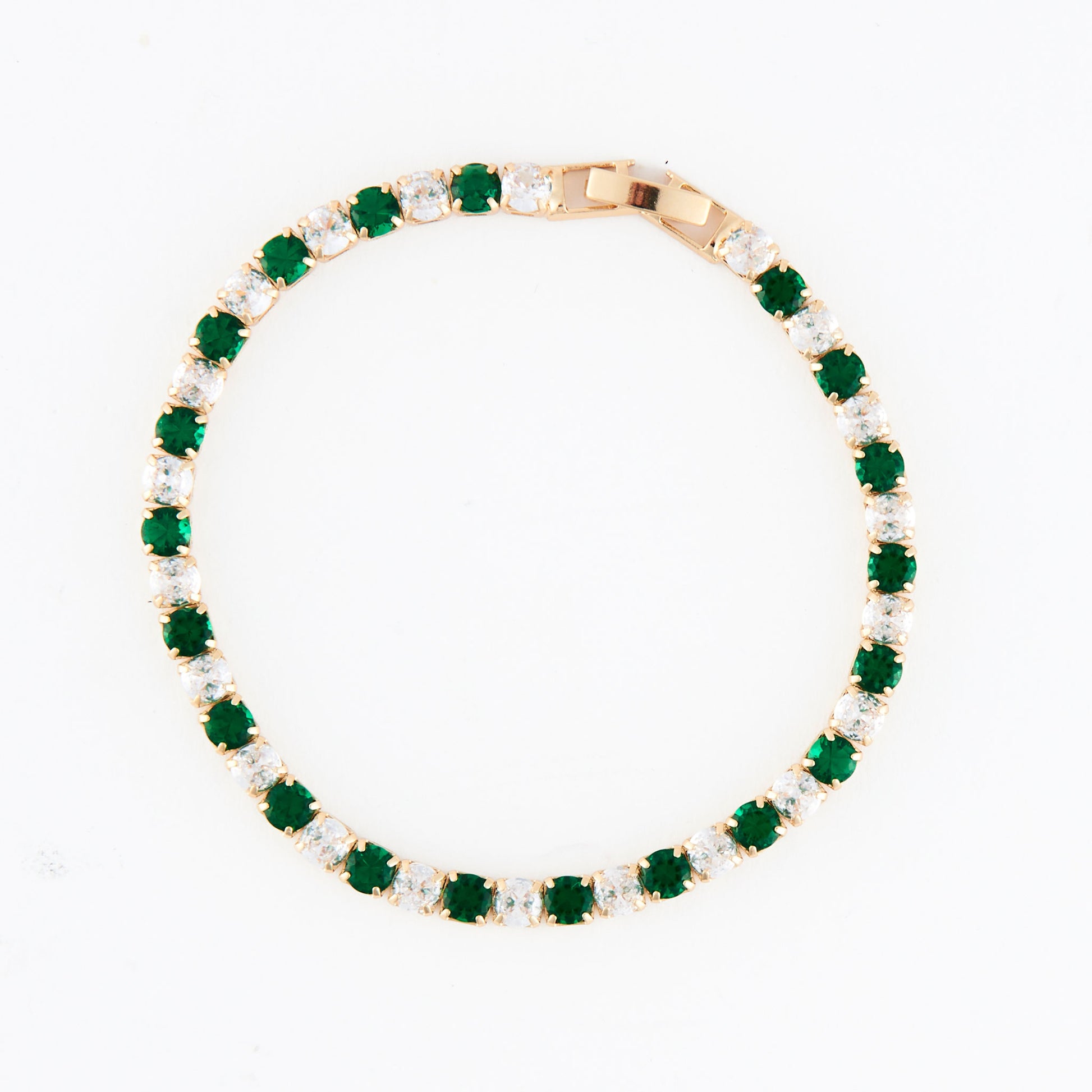 Stay glam with the Stella Round Gemstone Bracelet. Featuring vibrant green and clear round glass gemstones and fold-over clasp, this cutie adds glam flair to any look.