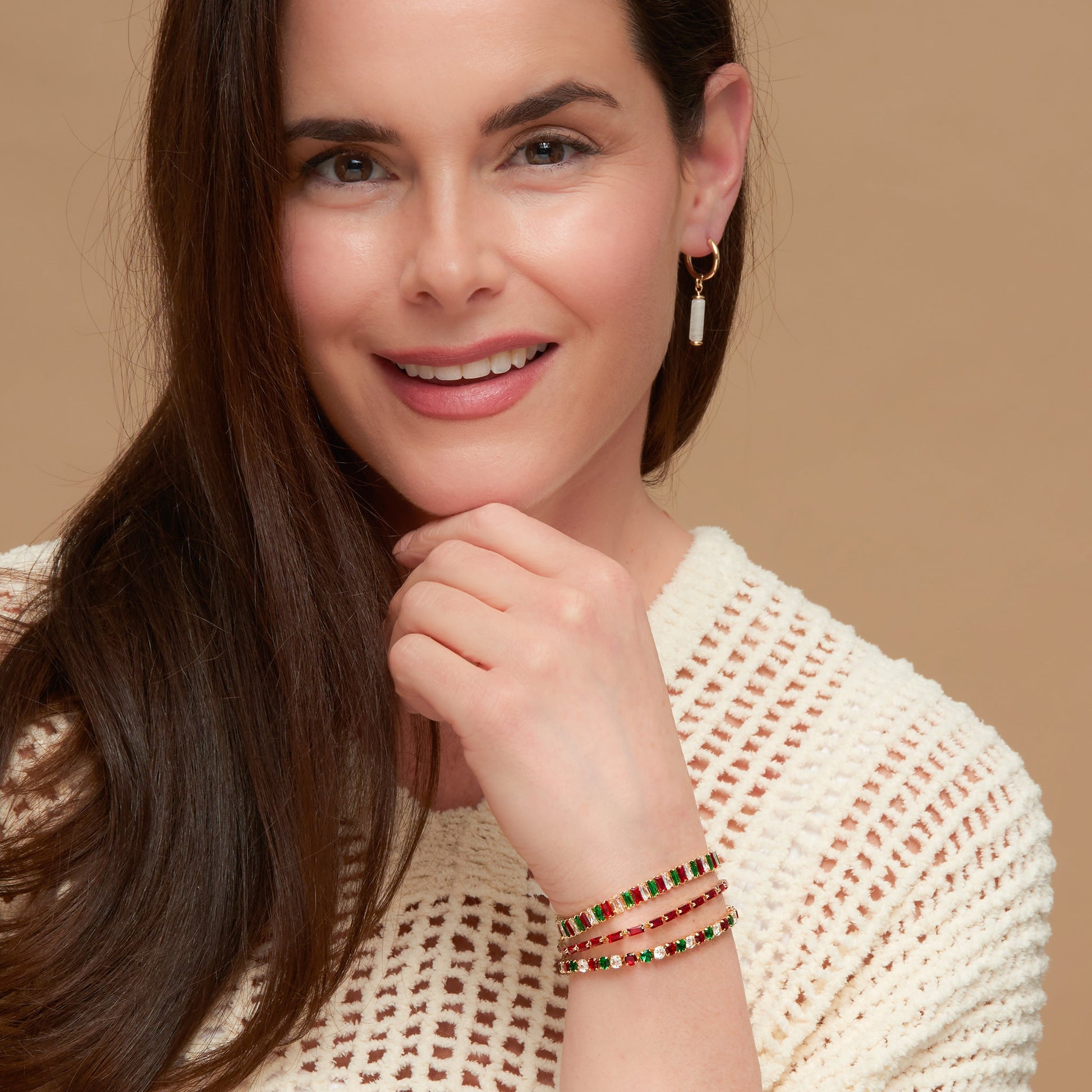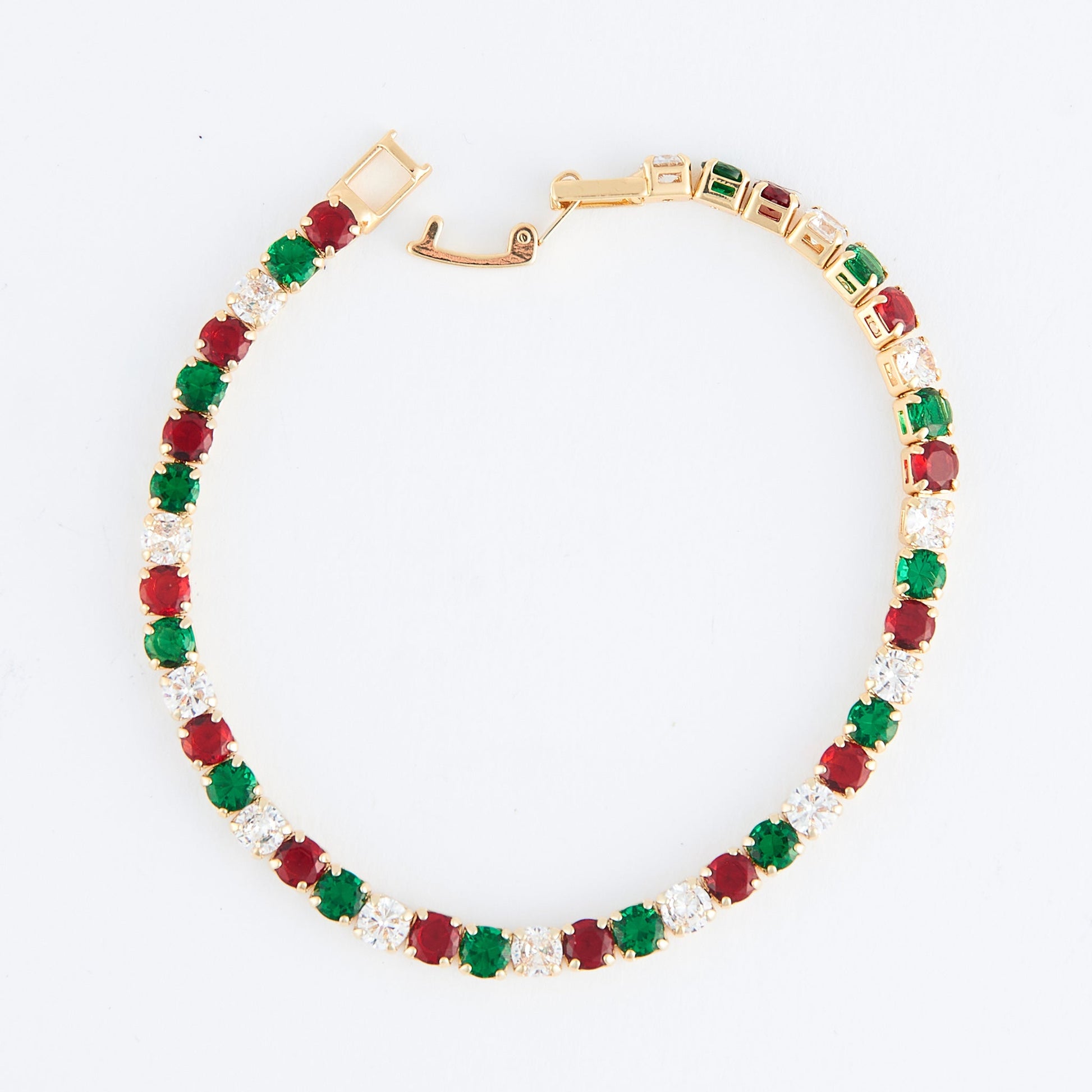 Stay festive and fun this holiday season with the Stella Round Gemstone Bracelet. Featuring vibrant red, green, and clear round glass gemstones and fold-over clasp, this cutie adds cheery flair to any look.