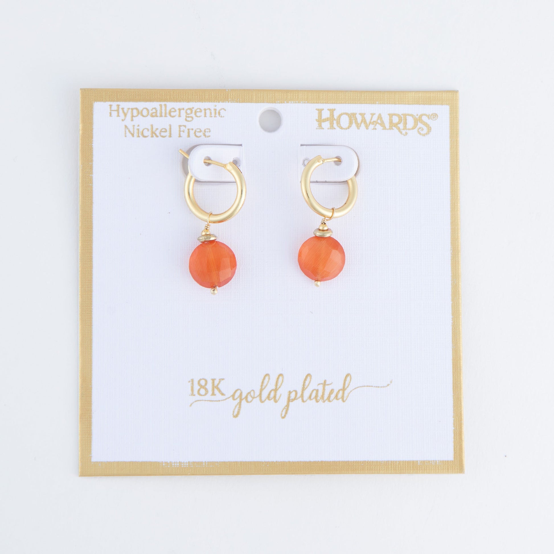 Add some color to your day with the Tahani 18k Gold Genuine Carnelian Hoop Earrings. Featuring vibrant orange Carnelian stone pendants hanging off 18k gold plated hoops, these beauties will make your look pop.