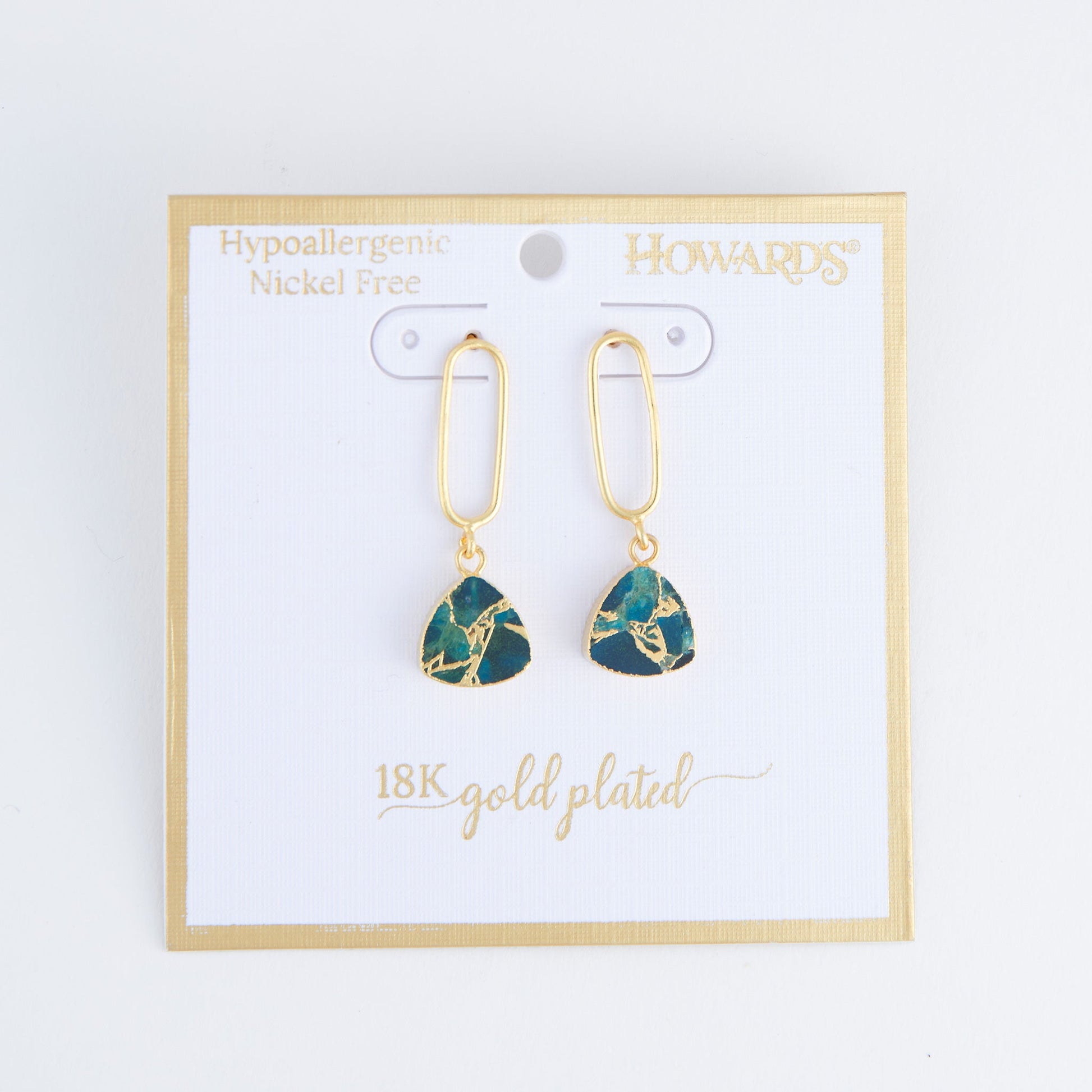 Add some color to your day with the Tahani Textured Stone 18k Gold Earrings. Featuring vibrant textured genuine stones hanging off chic 18k gold plated oval hoops, these post earrings will make your look pop.
