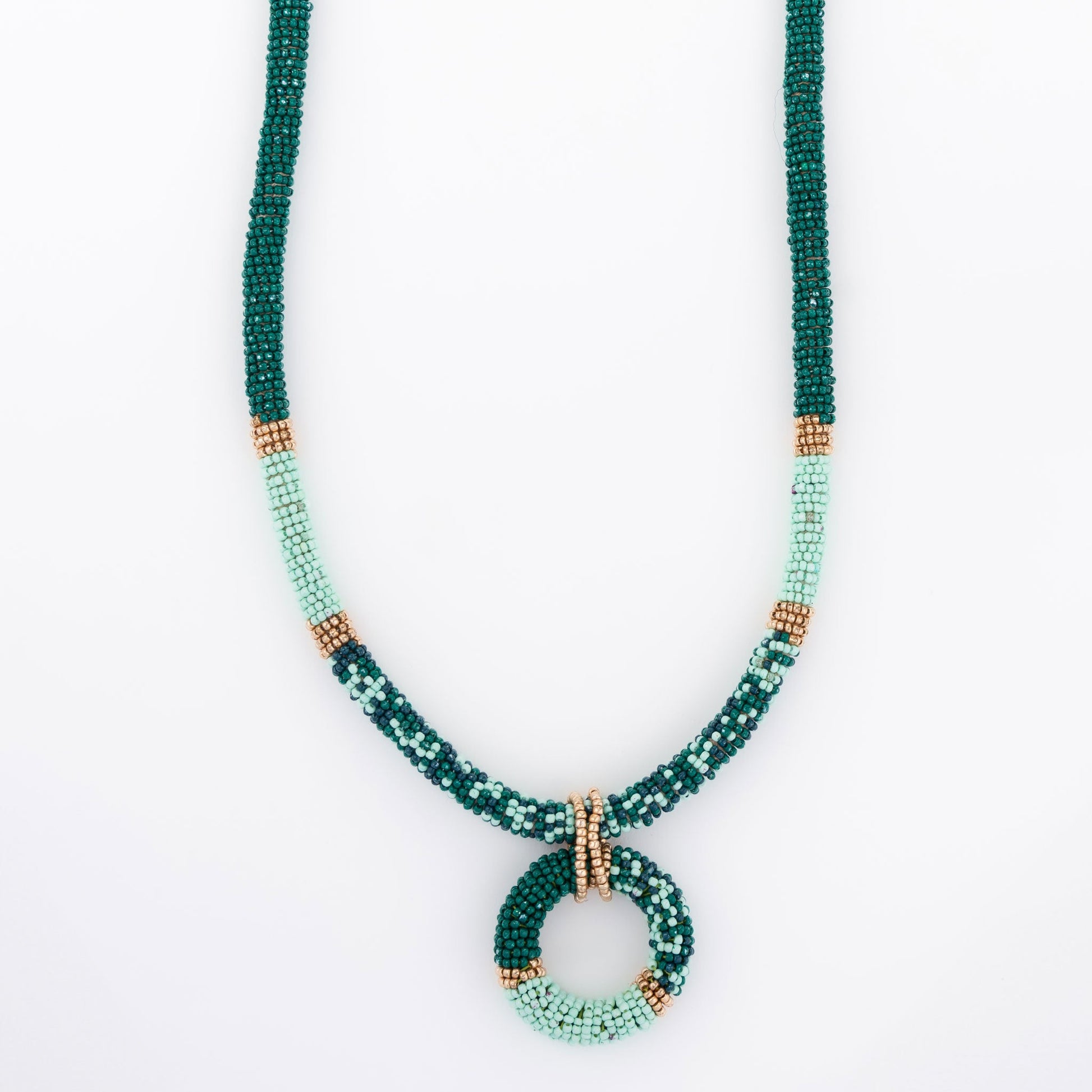 Elevate your look with the Tansy Seed Bead Ring Necklace. Featuring seed beads in vibrant turquoise hues and elegant circle pendant, this statement necklace adds unique style to any outfit.