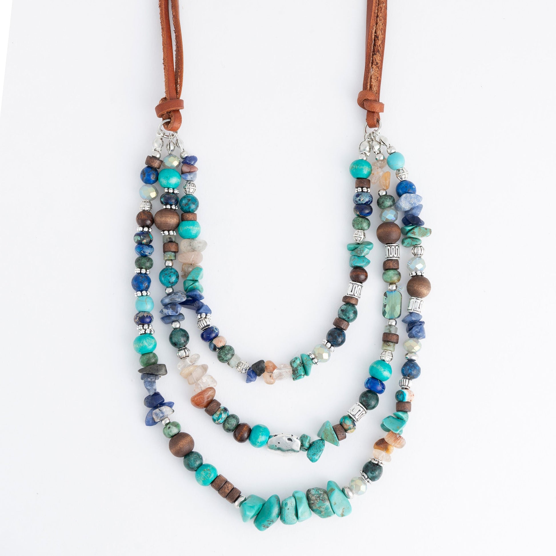 Create a unique, artisan look with the Tayla Leather Multi Row Genuine Stone Necklace. Featuring layered strands of genuine Emperor Pine, Turquoise, Lapis, and wood beads cascading from a leather band, this piece effortlessly adds a bit of personality to any outfit.