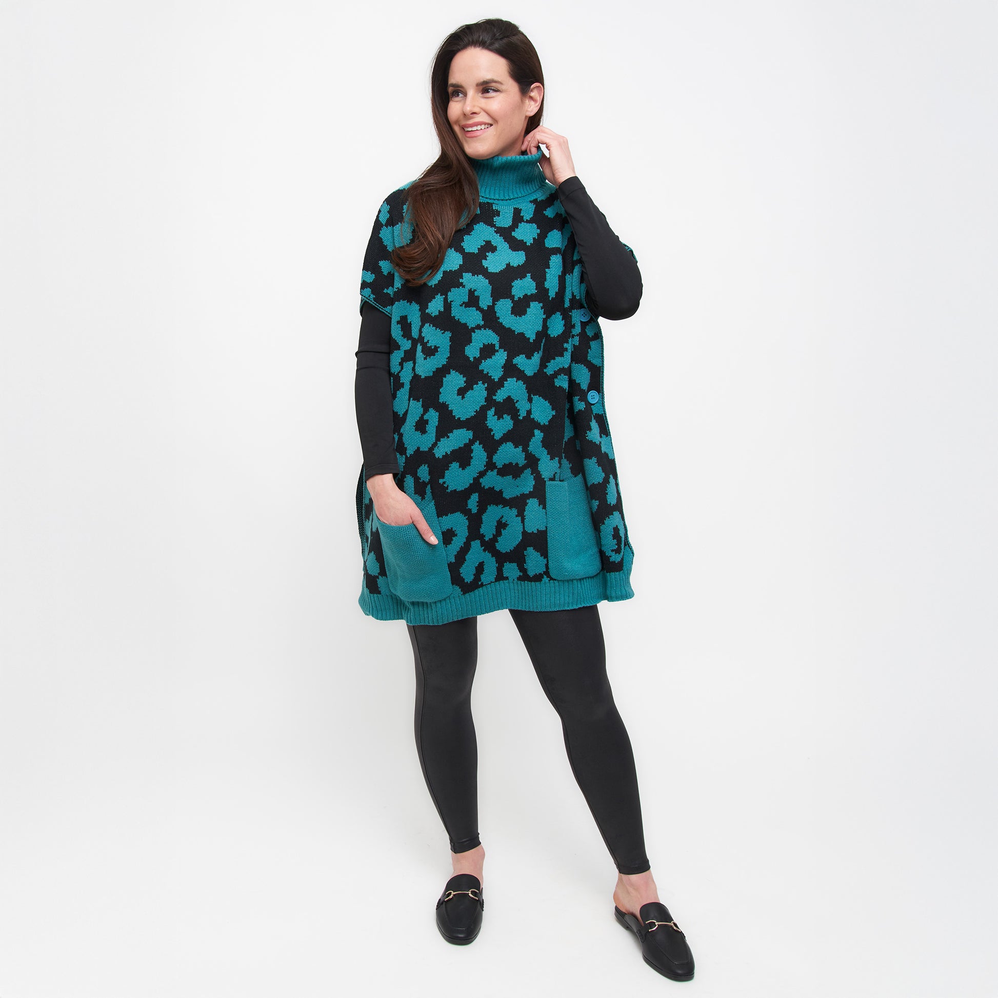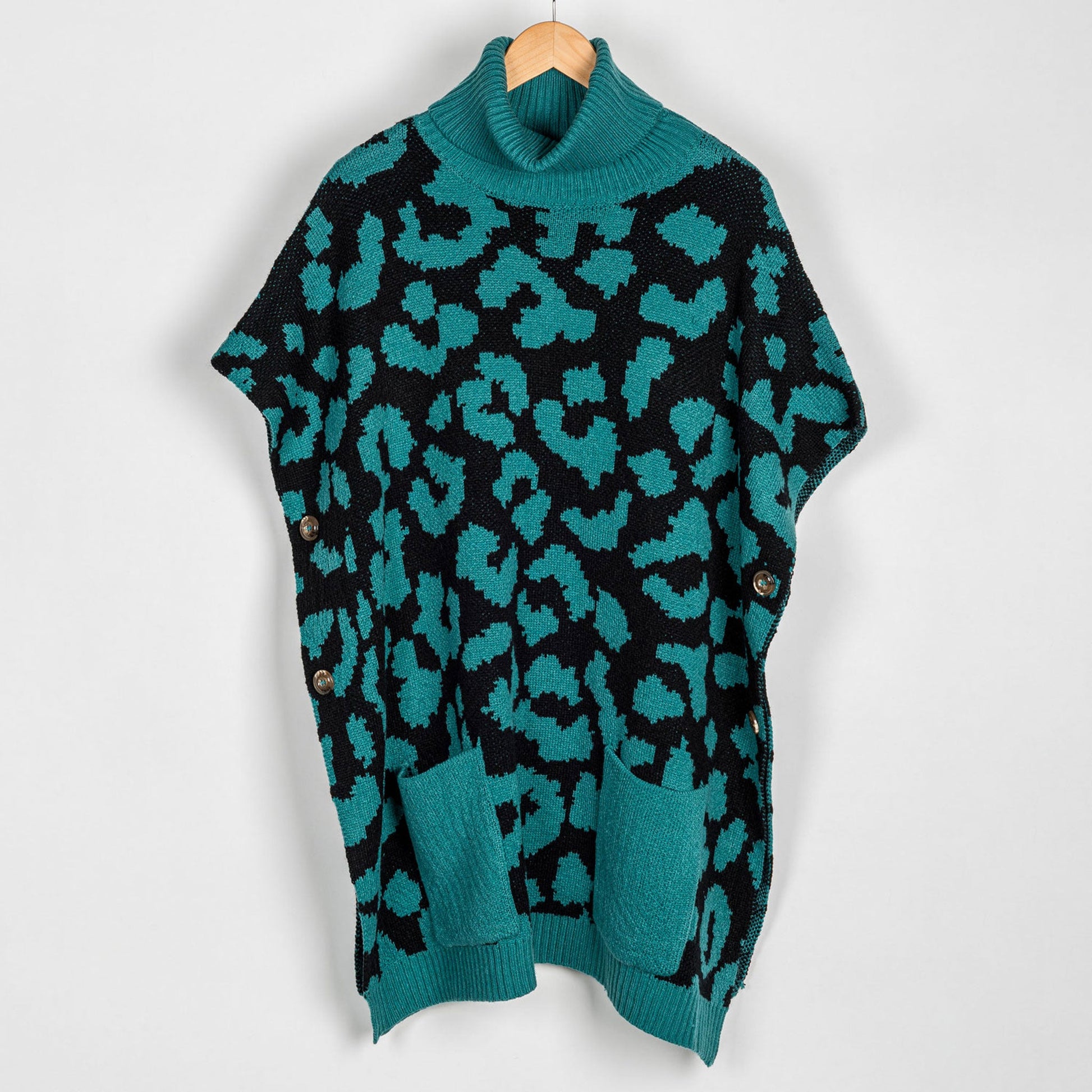 Teal Leopard Turtleneck Poncho With Patch Pockets - Os