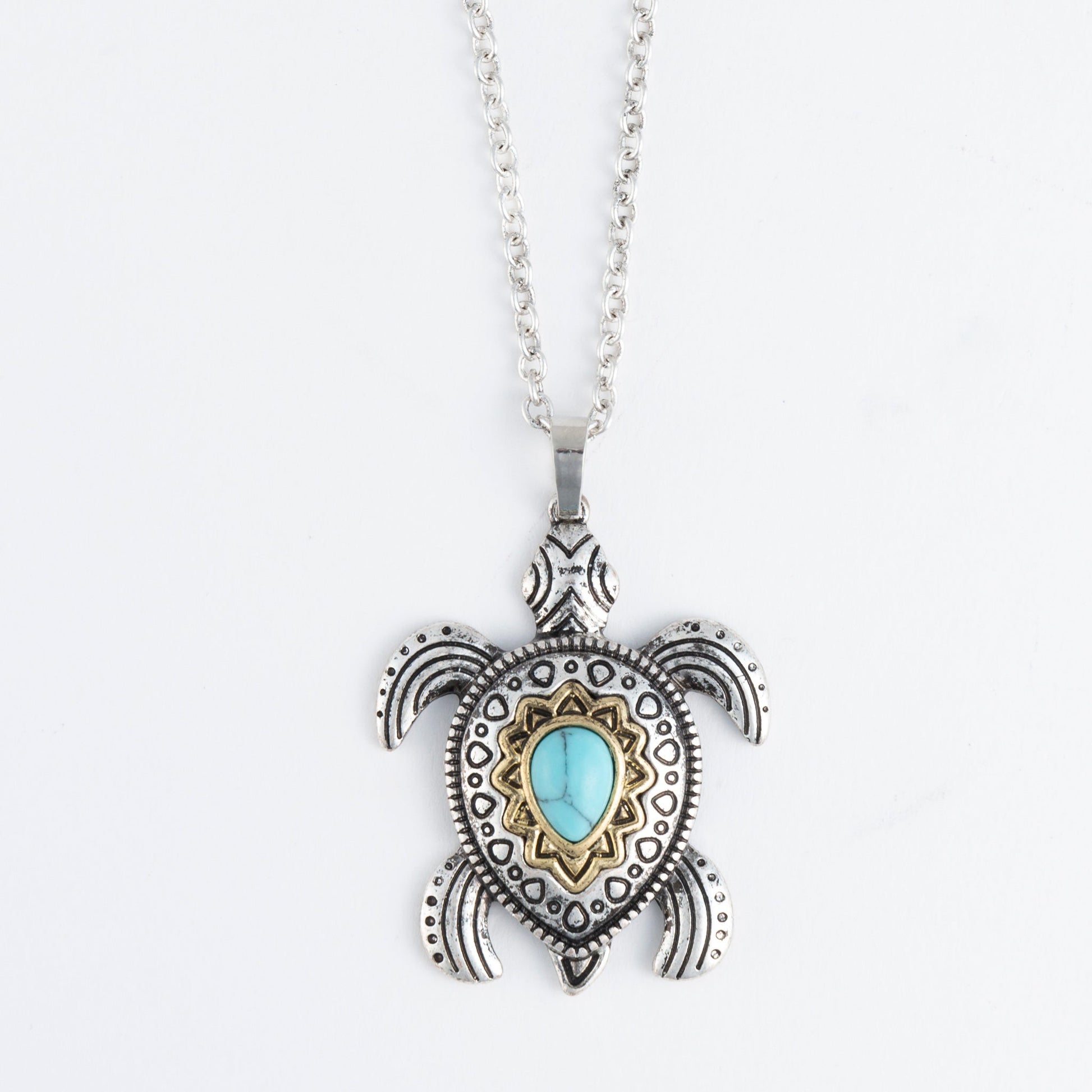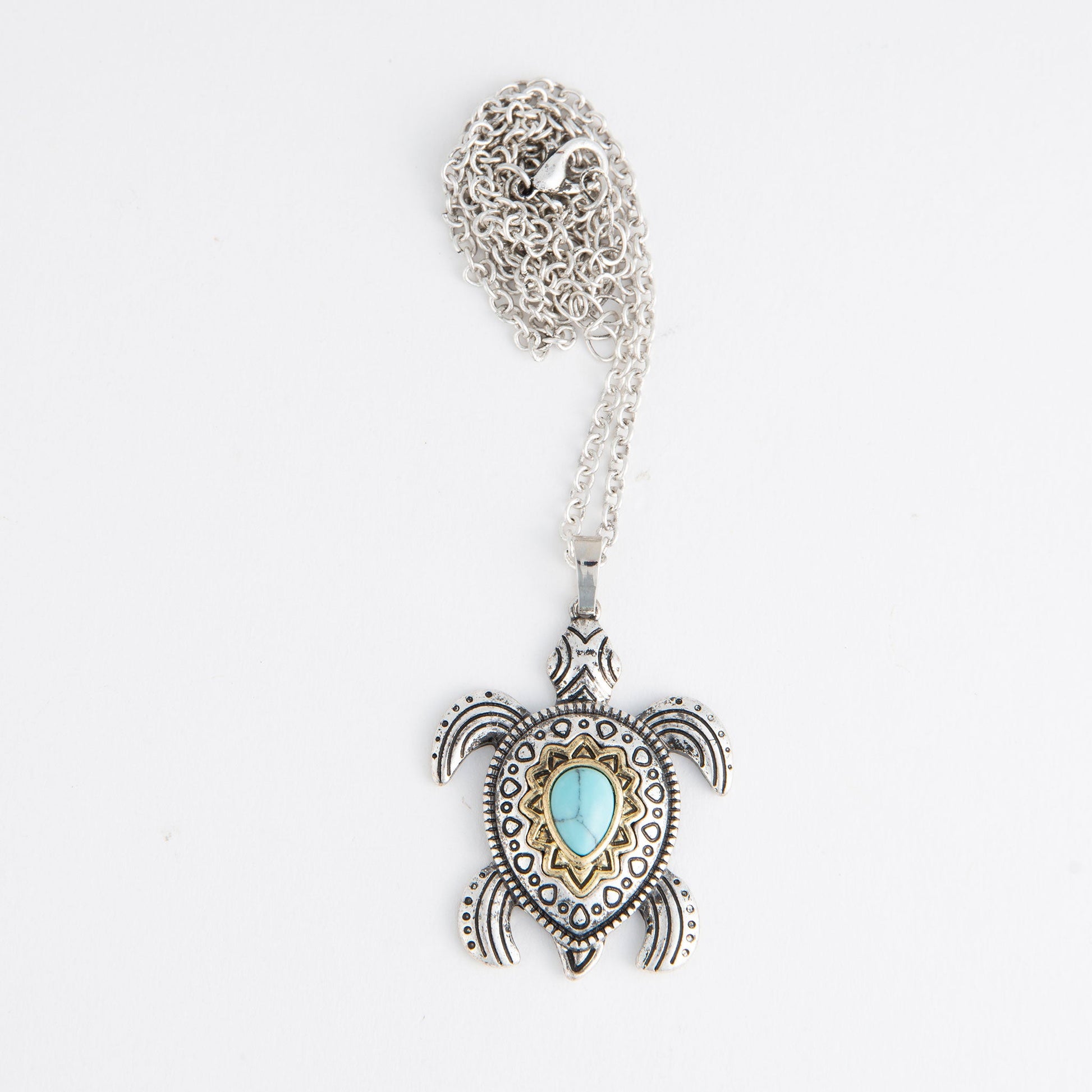 Make a statement with the Teegan Sea Turtle Pendant Necklace. Featuring a vibrant turquoise stone embedded into an intricately detailed silver sea turtle pendant, this necklace is sure to add interest to any outfit.