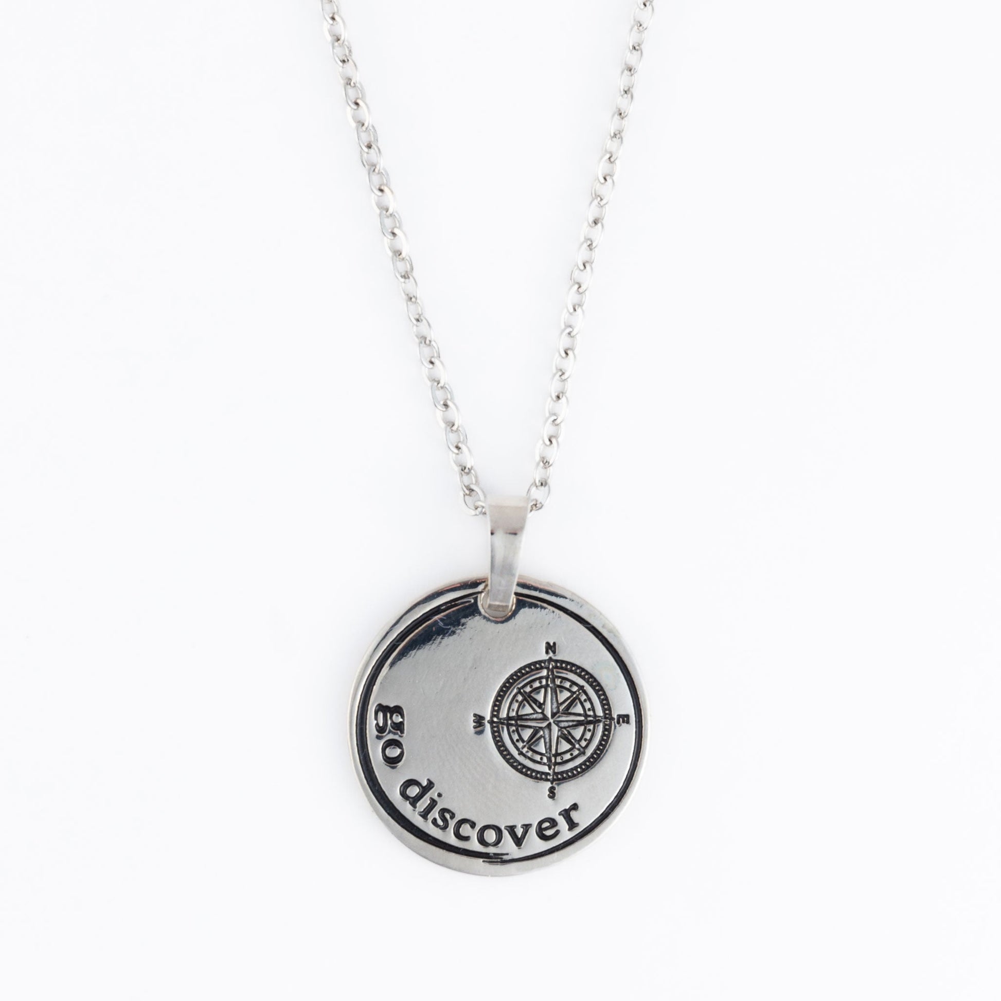 Perfect for those who like to wander! The Terah Go Discover Pendant Necklace features a silver circular pendant stamped with a compass and inspirational phrase, "go discover". Neutral in design and easy to wear, this necklace is certain to become a staple.