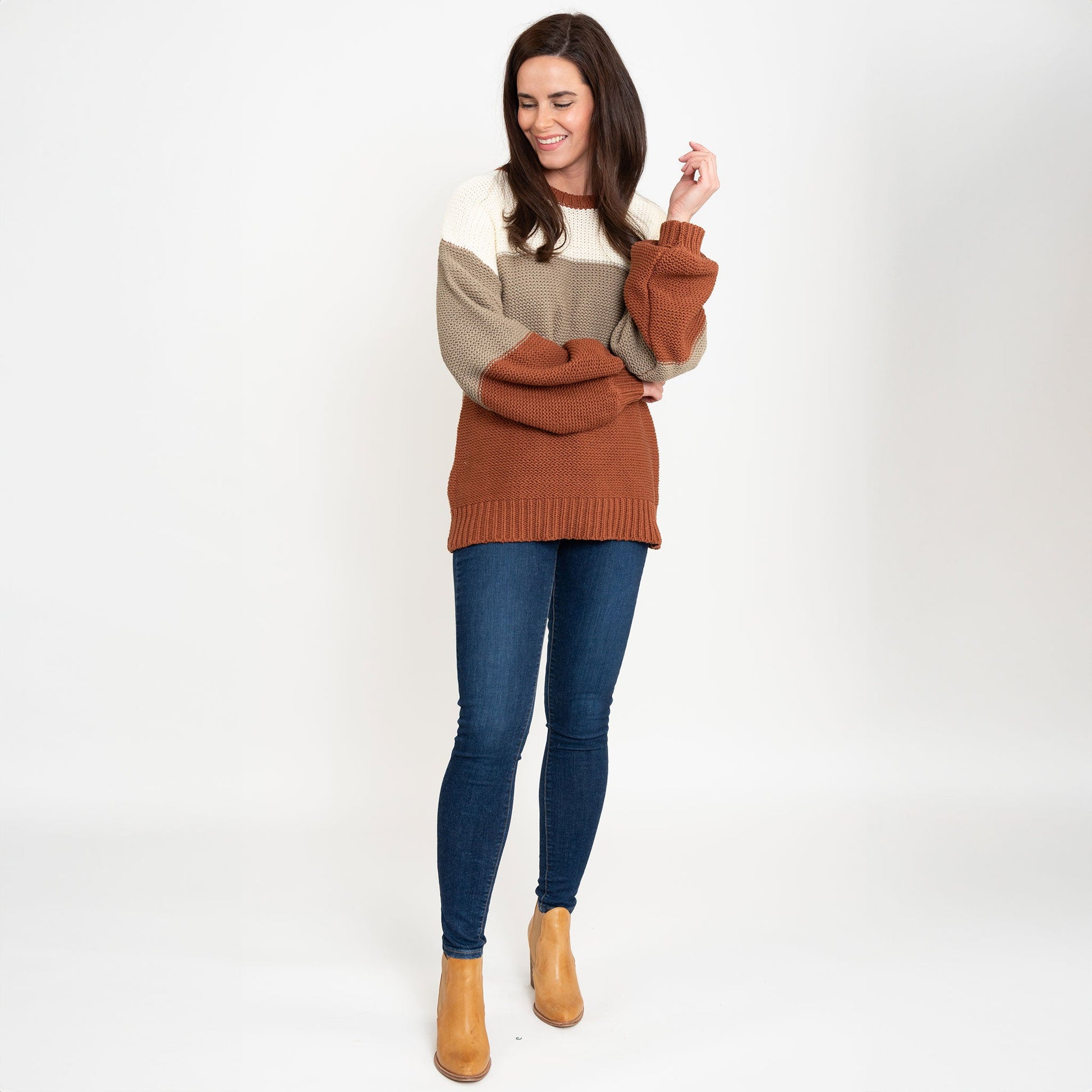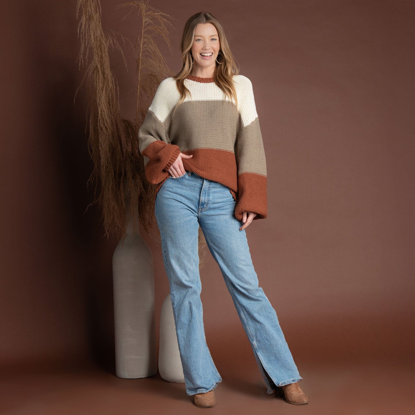 Cute in color block! The Tierra Color Block Chunky Sweater features a gorgeous mocha, orange, and white color block design with comfy oversized sleeves and trendy relaxed fit, all in a super cozy knit. Stylish and comfy, this sweater is an absolute wardrobe essential.