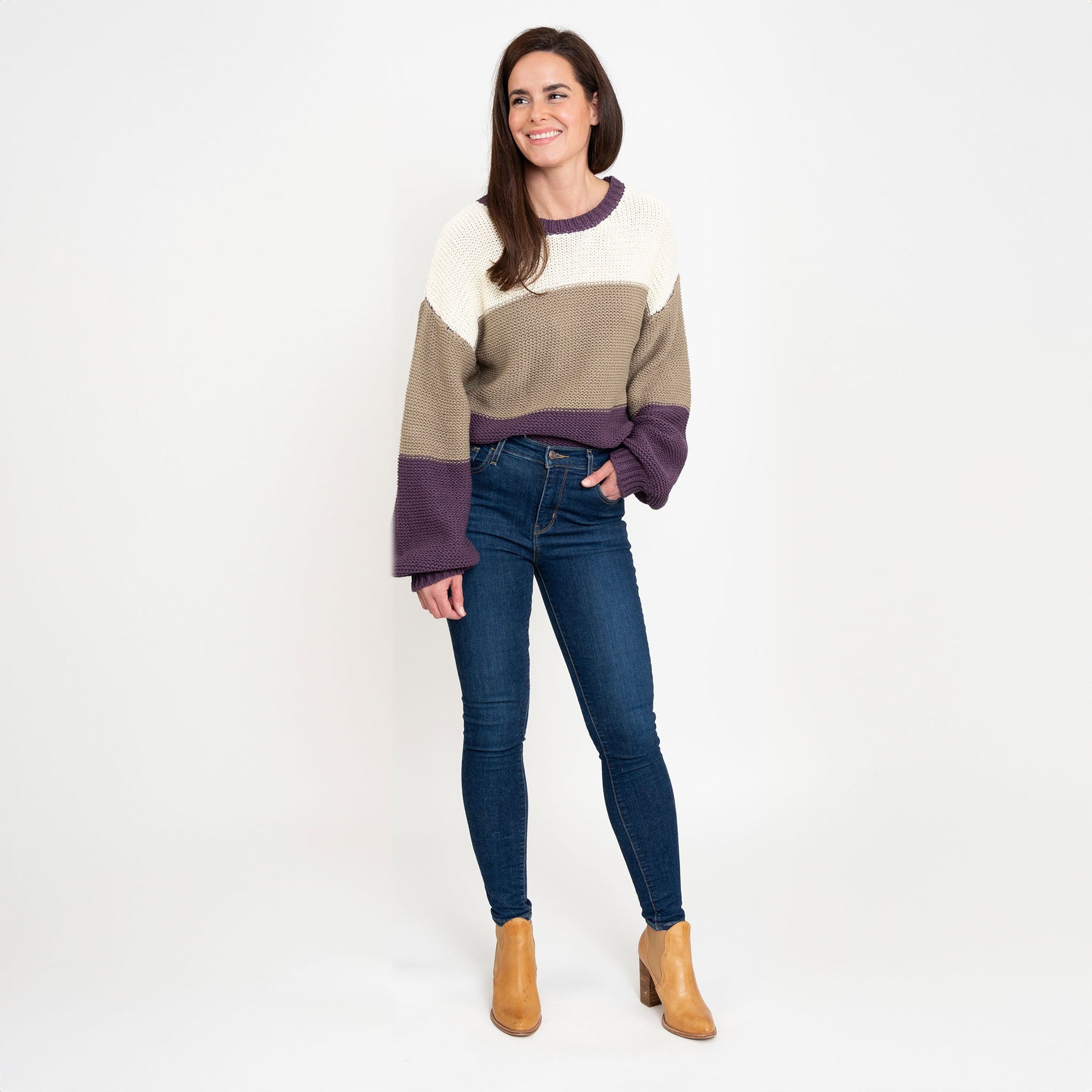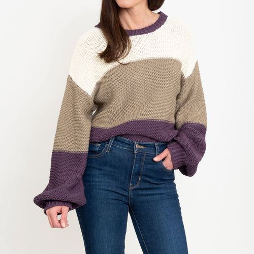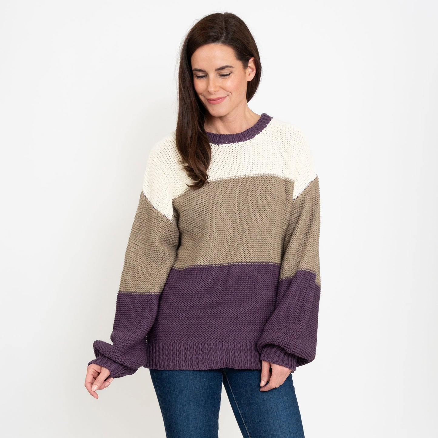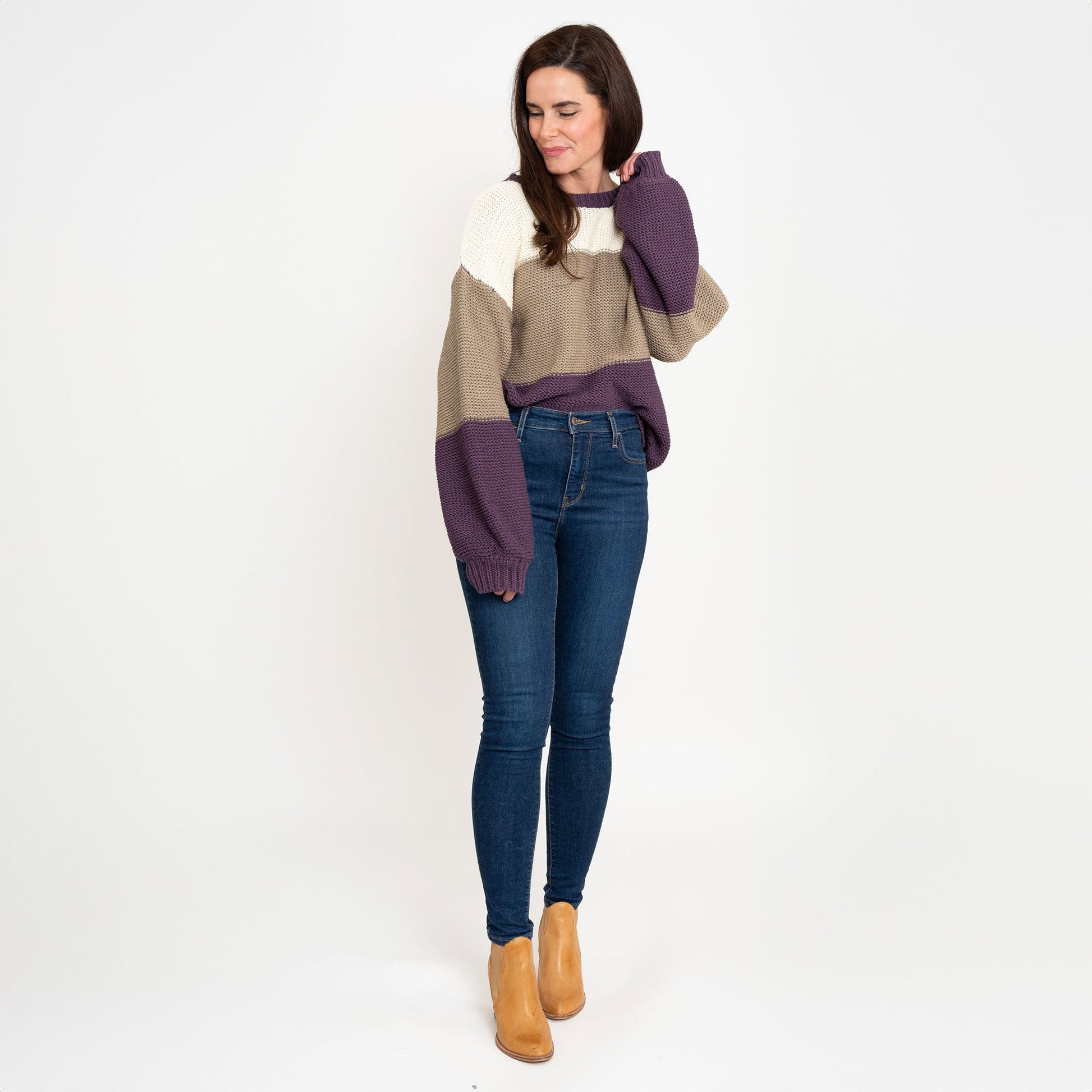 Cute in color block! The Tierra Color Block Chunky Sweater features a gorgeous mocha, plum, and white color block design with comfy oversized sleeves and trendy relaxed fit, all in a super cozy knit. Stylish and comfy, this sweater is an absolute wardrobe essential.