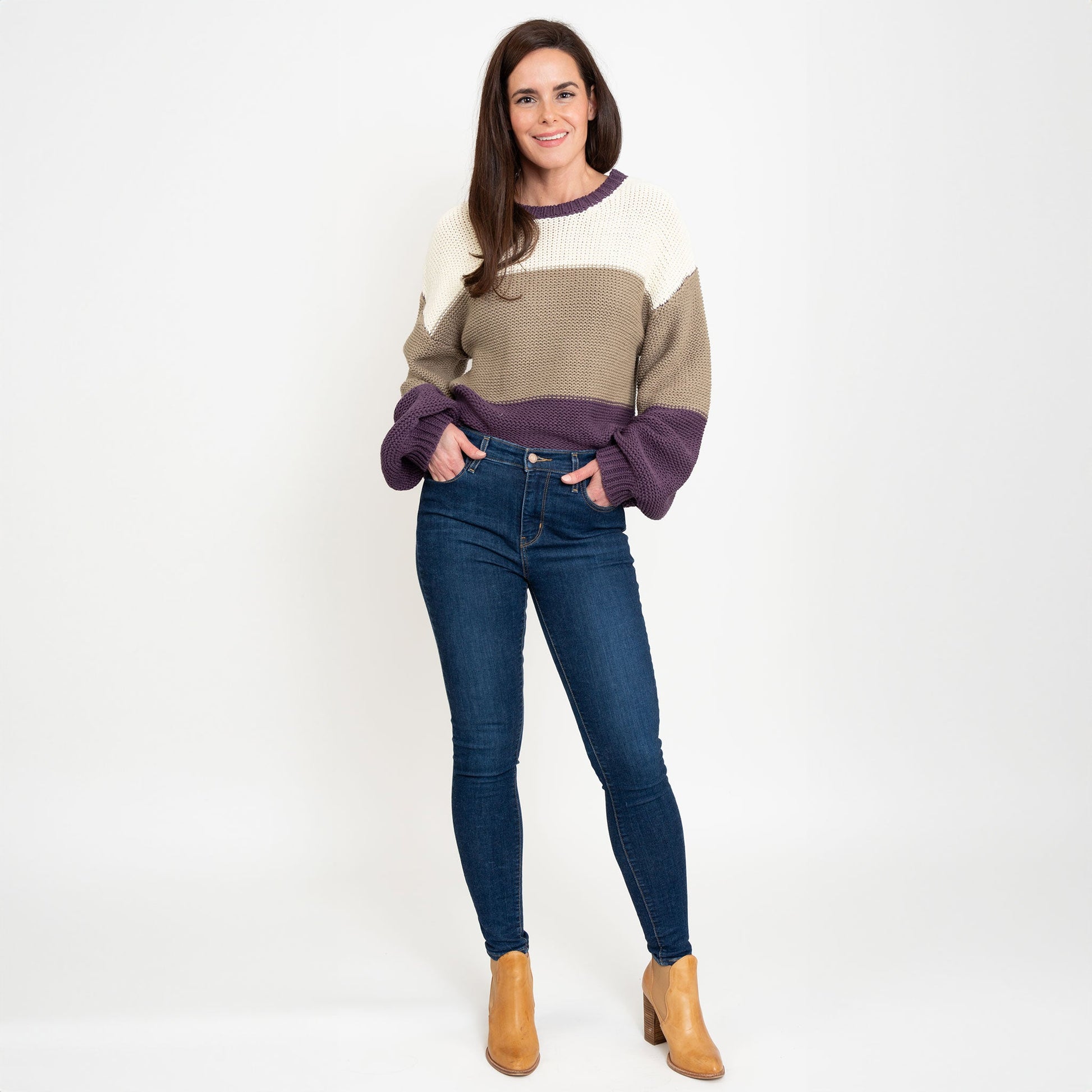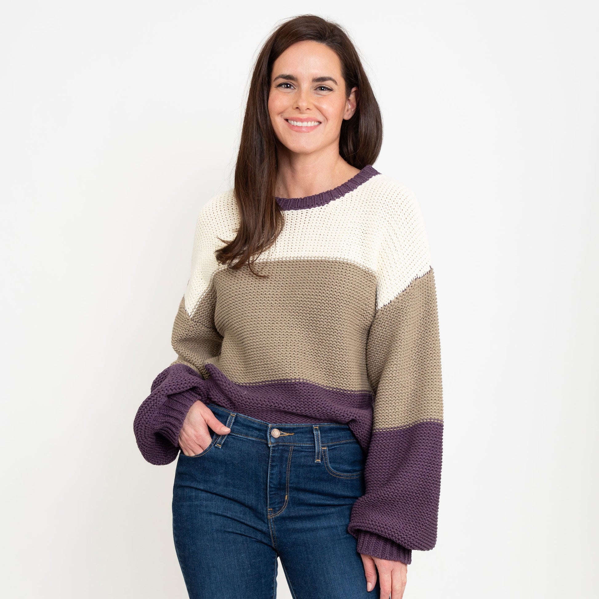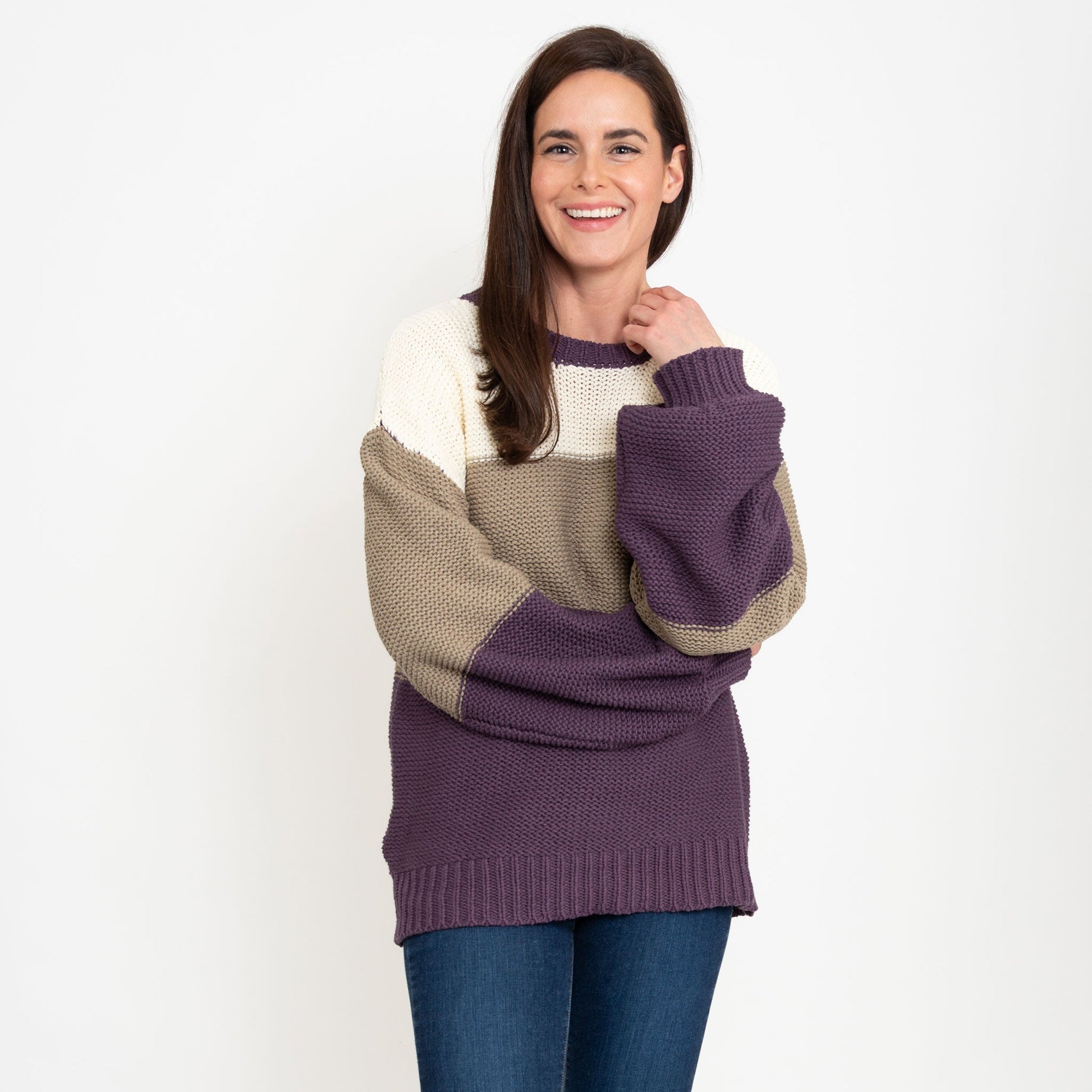 Cute in color block! The Tierra Color Block Chunky Sweater features a gorgeous mocha, plum, and white color block design with comfy oversized sleeves and trendy relaxed fit, all in a super cozy knit. Stylish and comfy, this sweater is an absolute wardrobe essential.