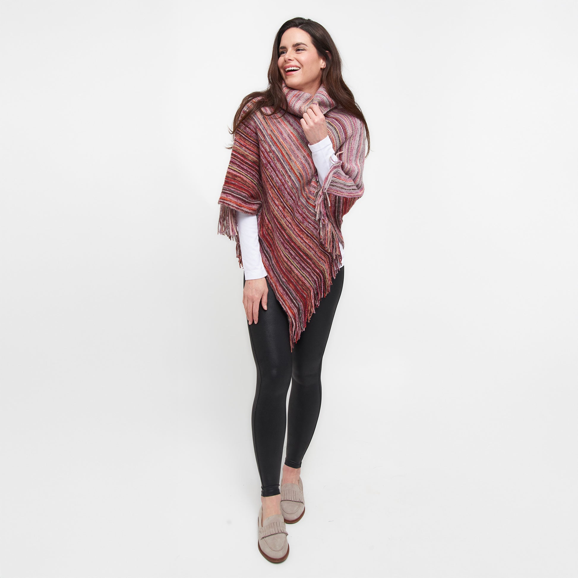 Cozy and cute! The Tiya Striped Funnel Neck Poncho features a flattering asymmetrical cut and stripes, warm funnel neck design, and chic tassel detailing. Style over your favorite pair of leggings for an easy look!