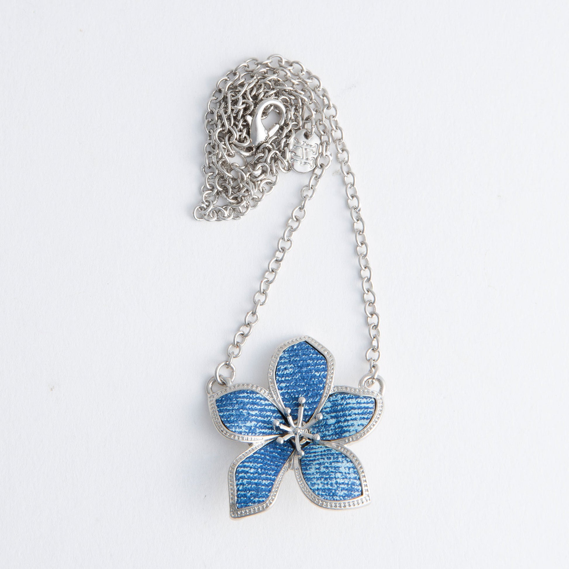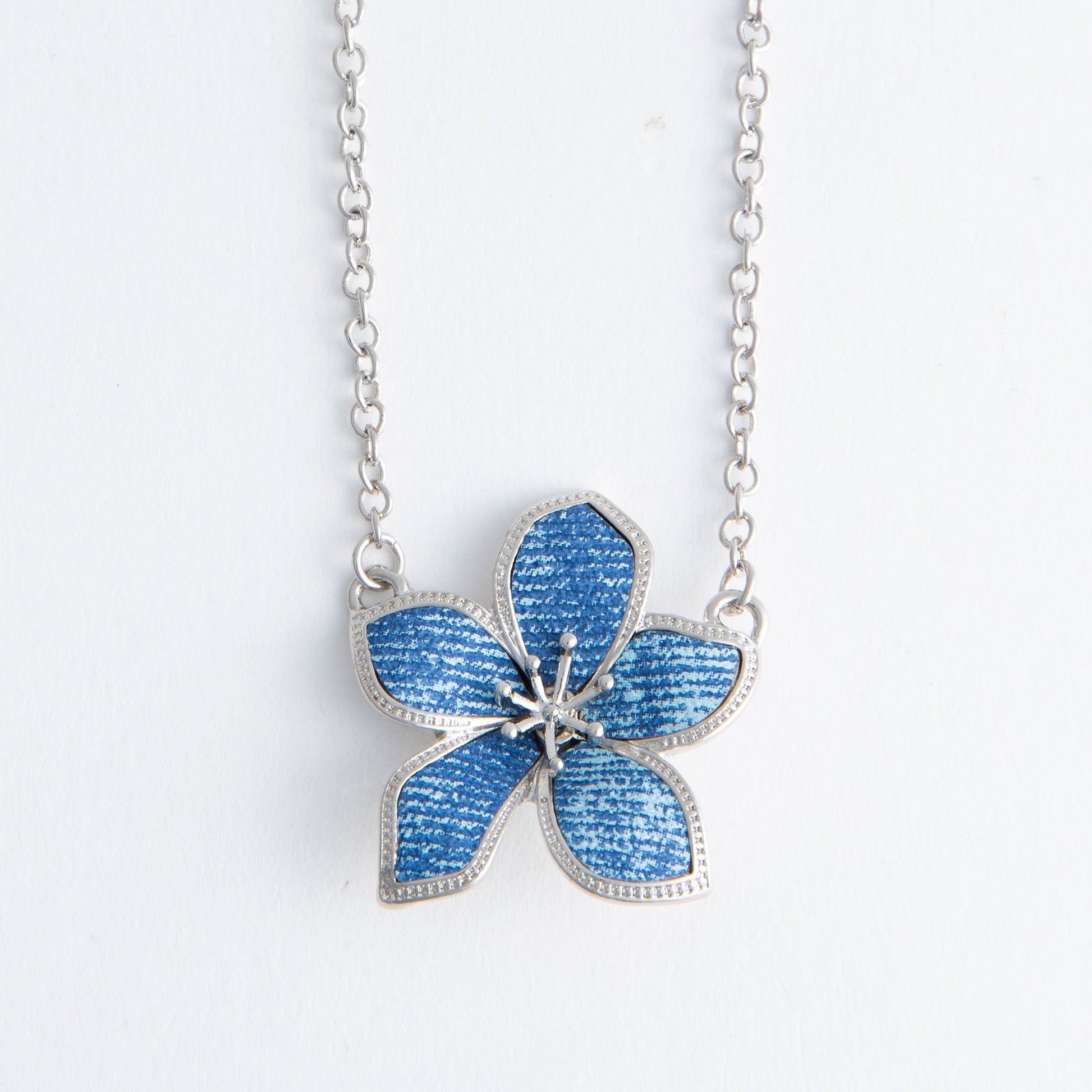Add a bit of interest to your outfit with the Tyla Denim Flower Pendant Necklace. Featuring a dainty silver chain with flower-shaped denim pendant, this necklace is a delightful accent piece.