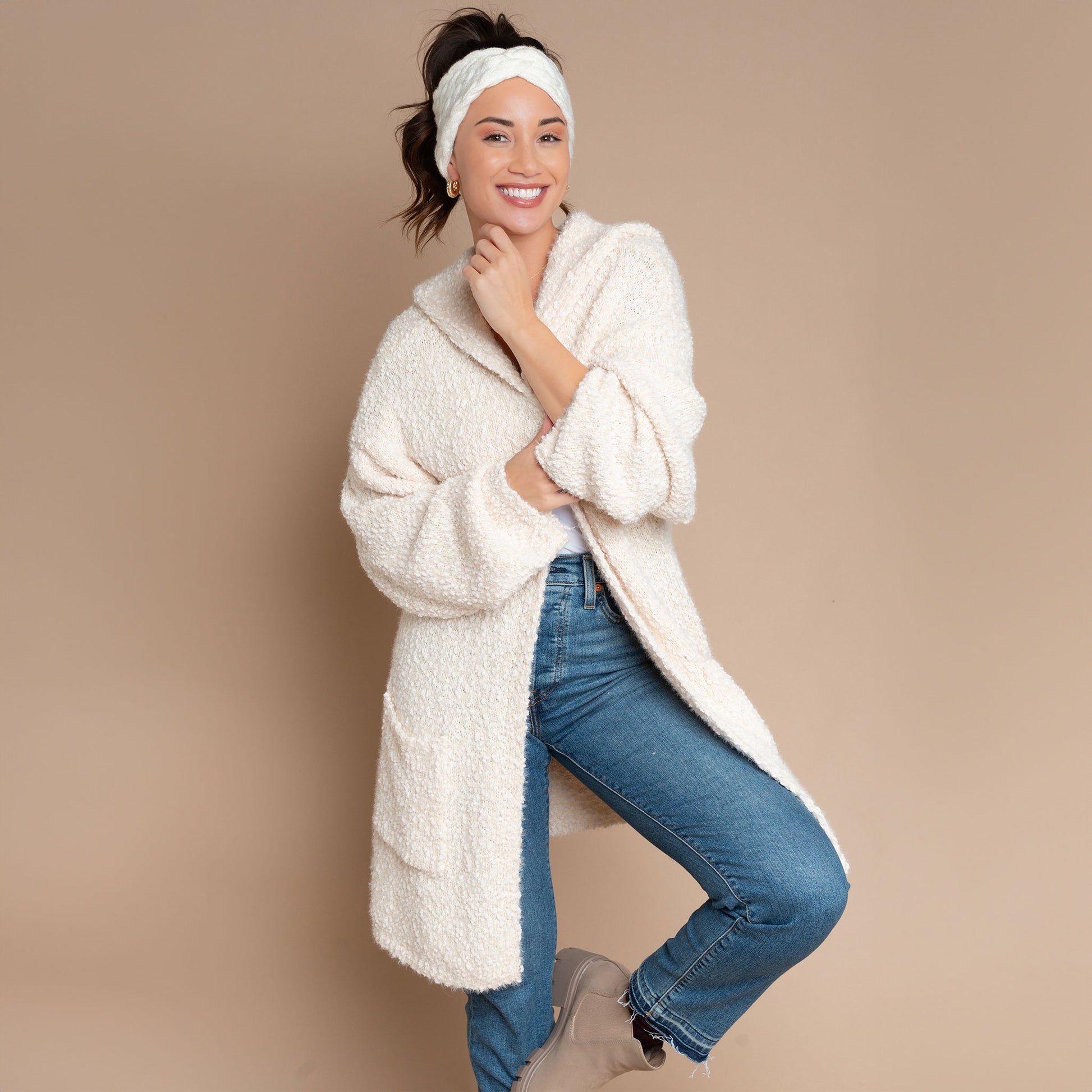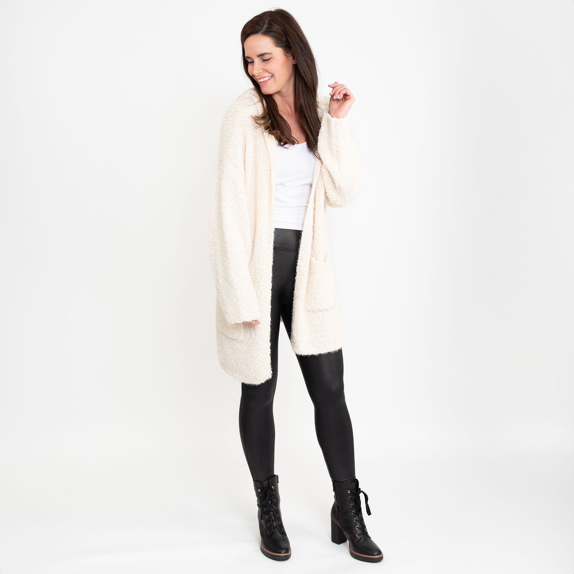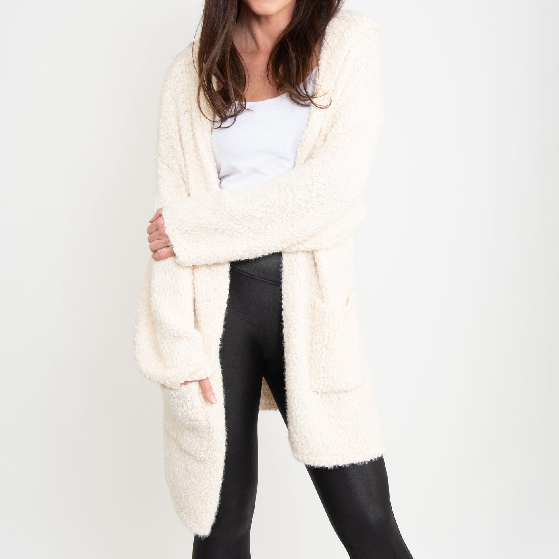 The cardigan you won't be able to take off! the Tylie Teddy Bear Cardigan features the softest teddy bear knit with cozy hood and pockets in a gorgeous marshmallow color. Its flattering longline design makes it perfect to wear over everything from your favorite dress to leggings and a t-shirt.