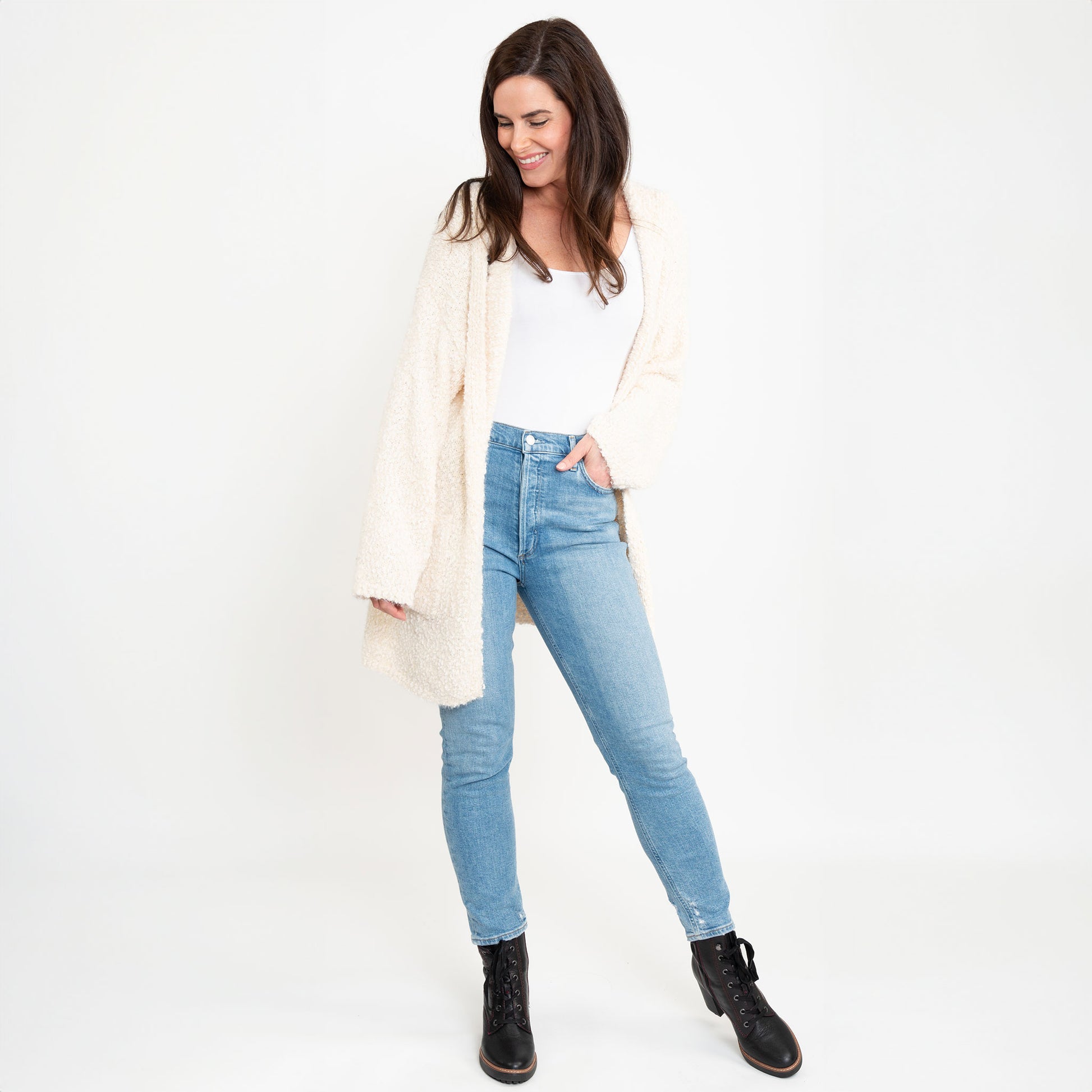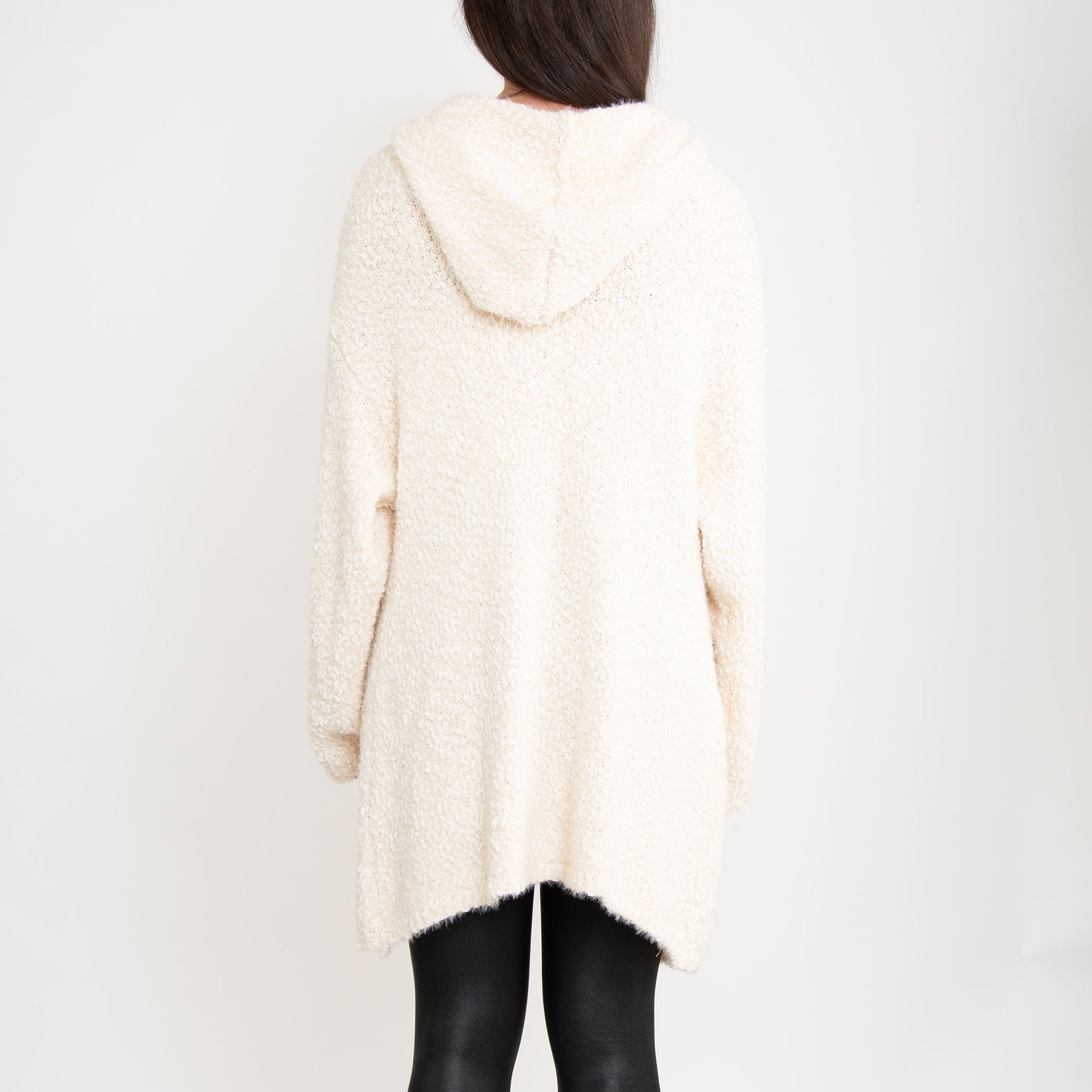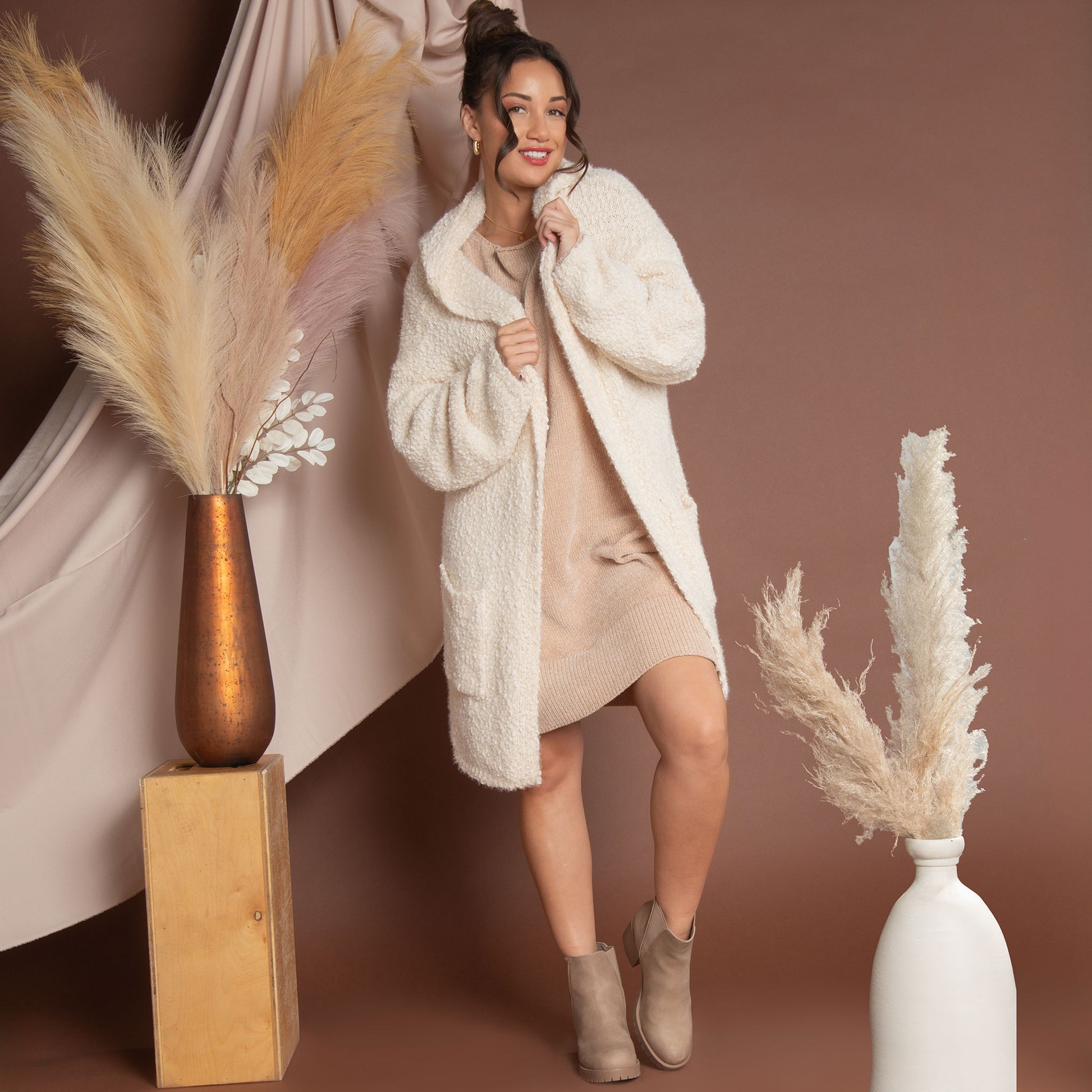 The cardigan you won't be able to take off! the Tylie Teddy Bear Cardigan features the softest teddy bear knit with cozy hood and pockets in a gorgeous marshmallow color. Its flattering longline design makes it perfect to wear over everything from your favorite dress to leggings and a t-shirt.