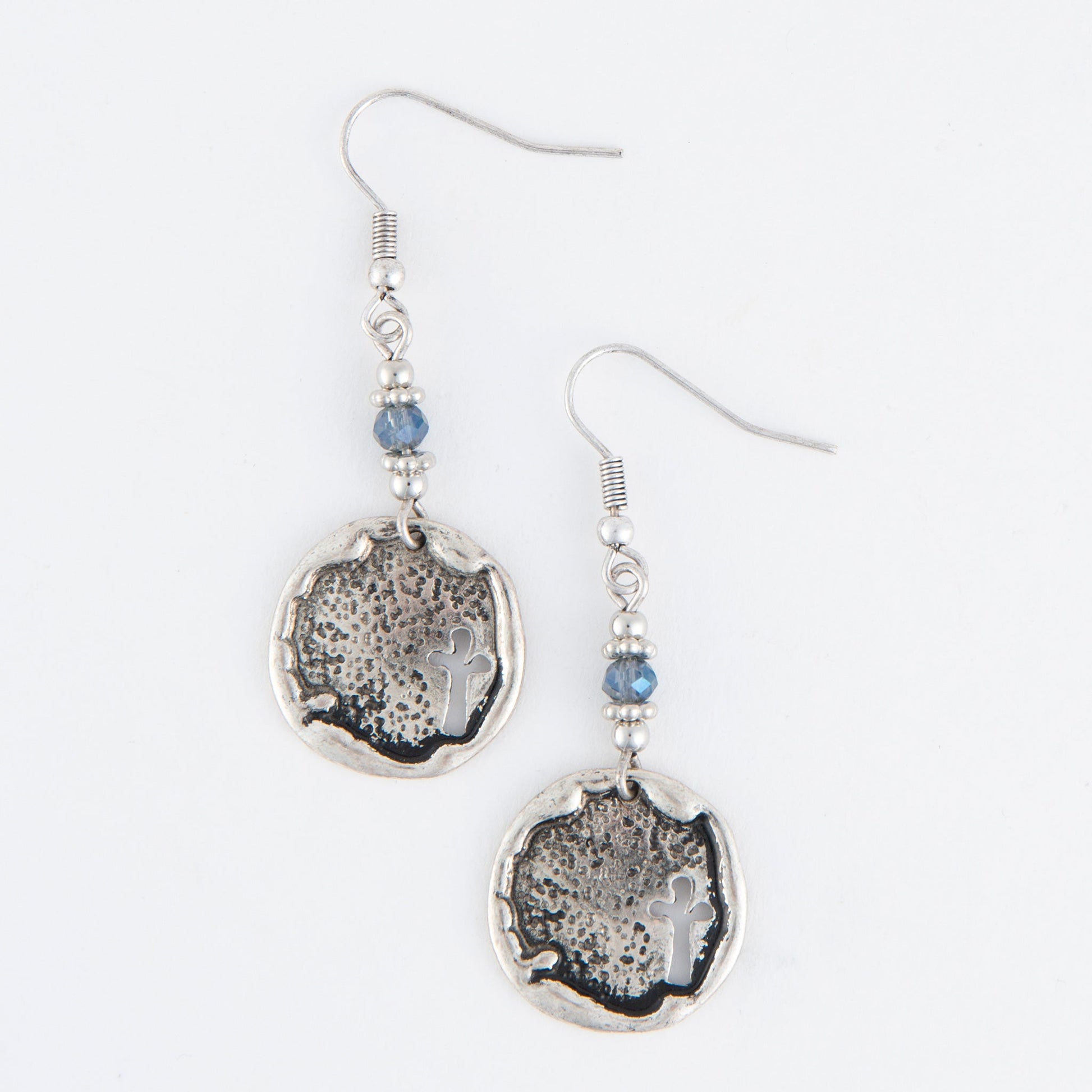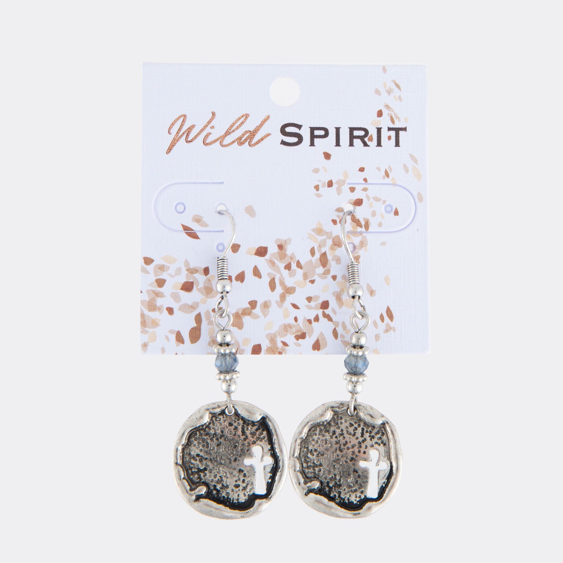 Create a unique, artisan look with the Wild Spirit Beaded Cross Earrings. Featuring silver discs with inspirational cross detailing and subtle blue beads, these earrings are certain to make a statement.