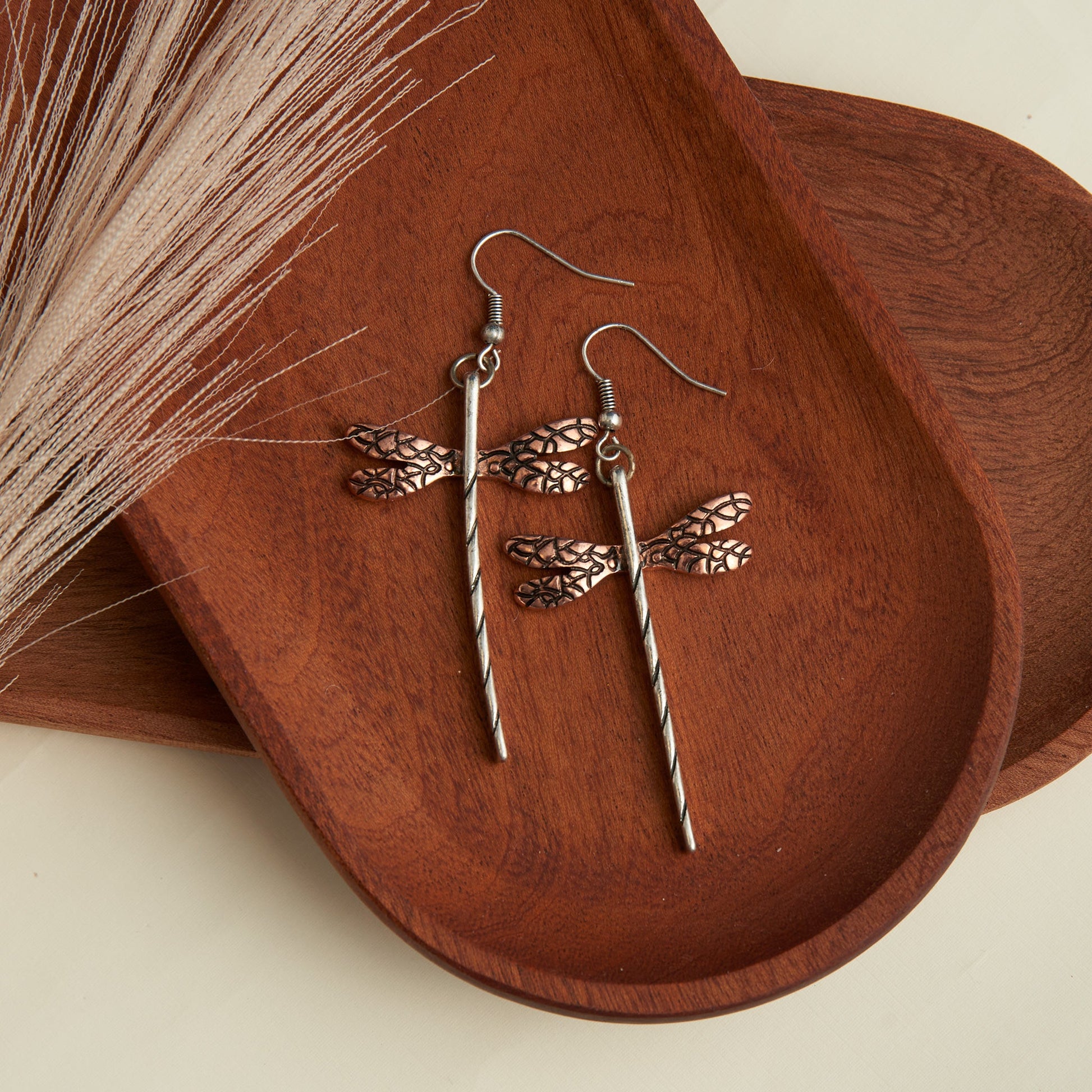 Create an effortlessly whimsical look with the Wild Spirit Dragonfly Earrings. Featuring a stunning two-tone silver and copper dragonfly design with textured and striped detailing, these cuties bring interest to any outfit.