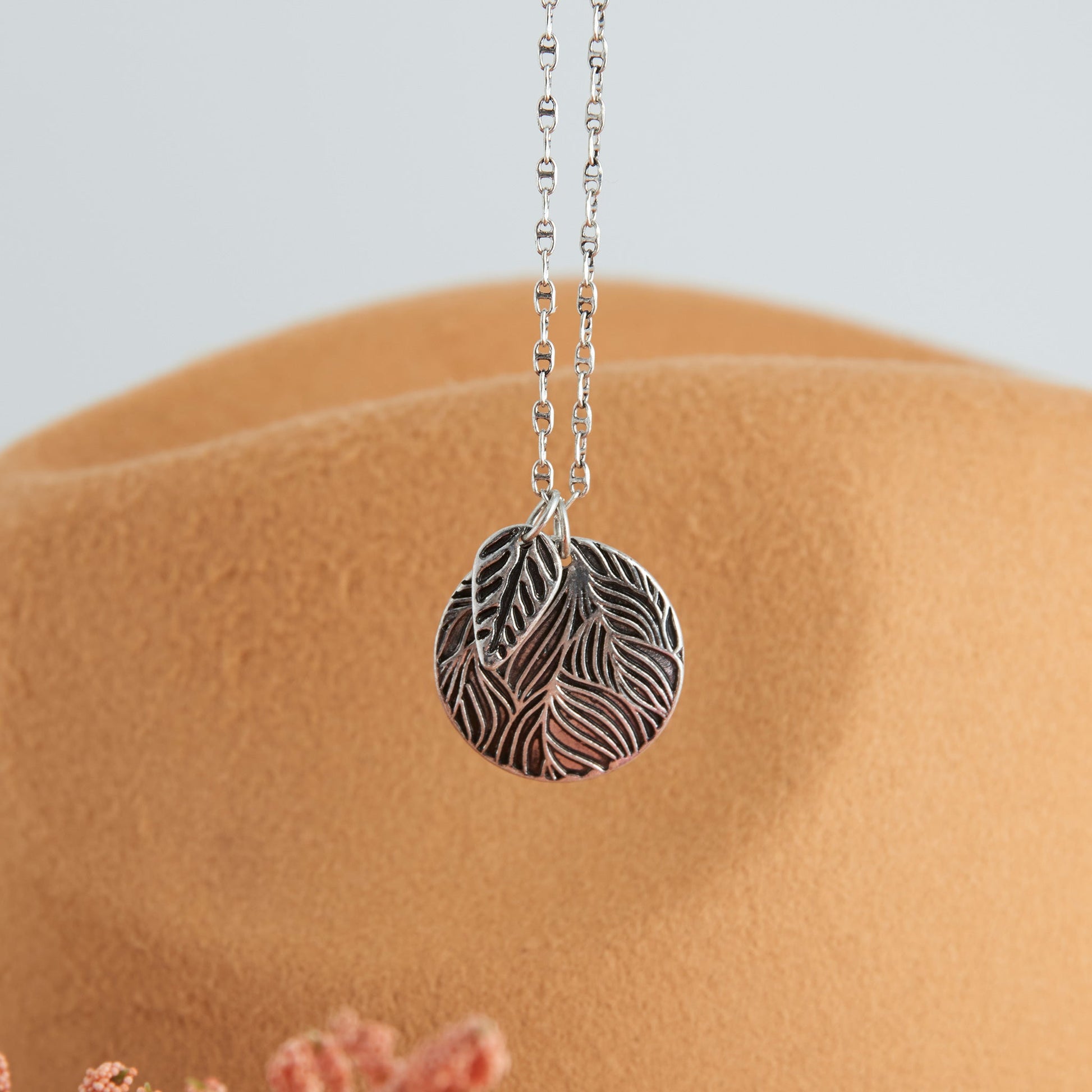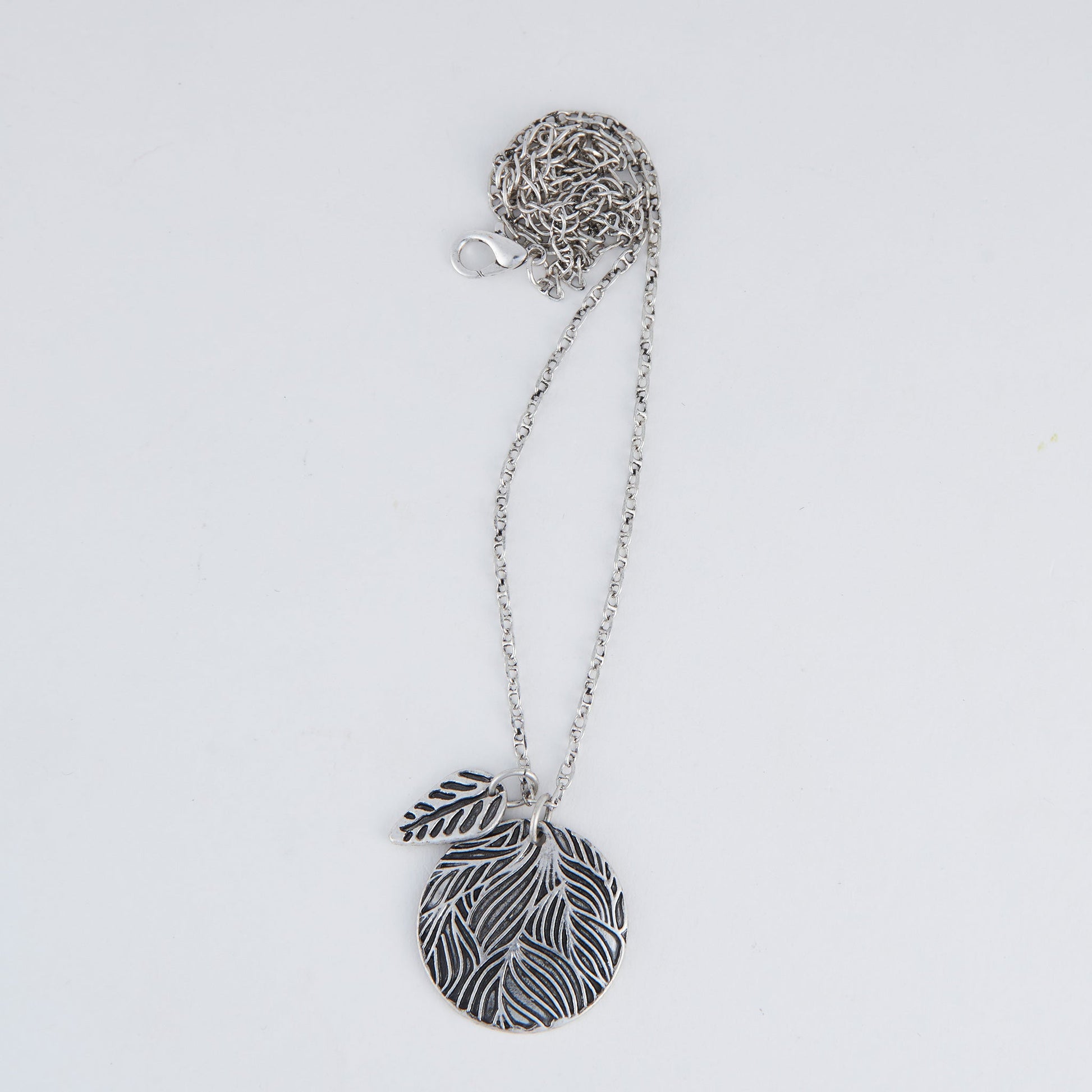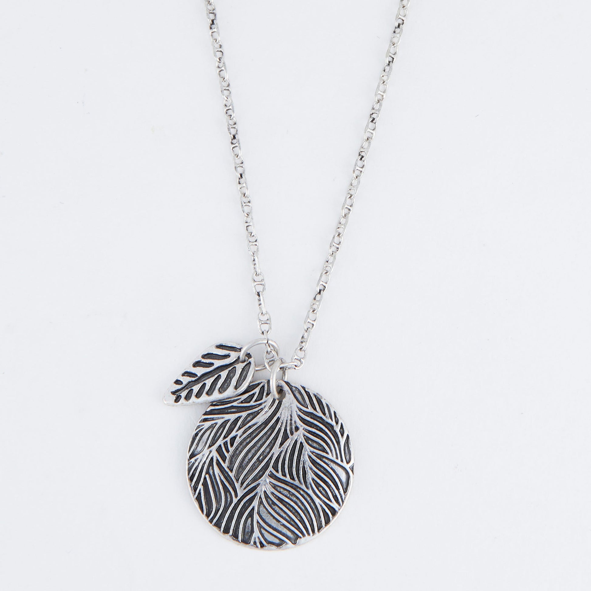 Perfect for every day wear, the Zara Engraved Leaf Pendant Necklace features a lovely silver disc pendant engraved with sweet leaf designs. The mini leaf charm floating off the disc pendant adds an extra bit of personality and the delicate silver chain makes it easy to wear all year long.