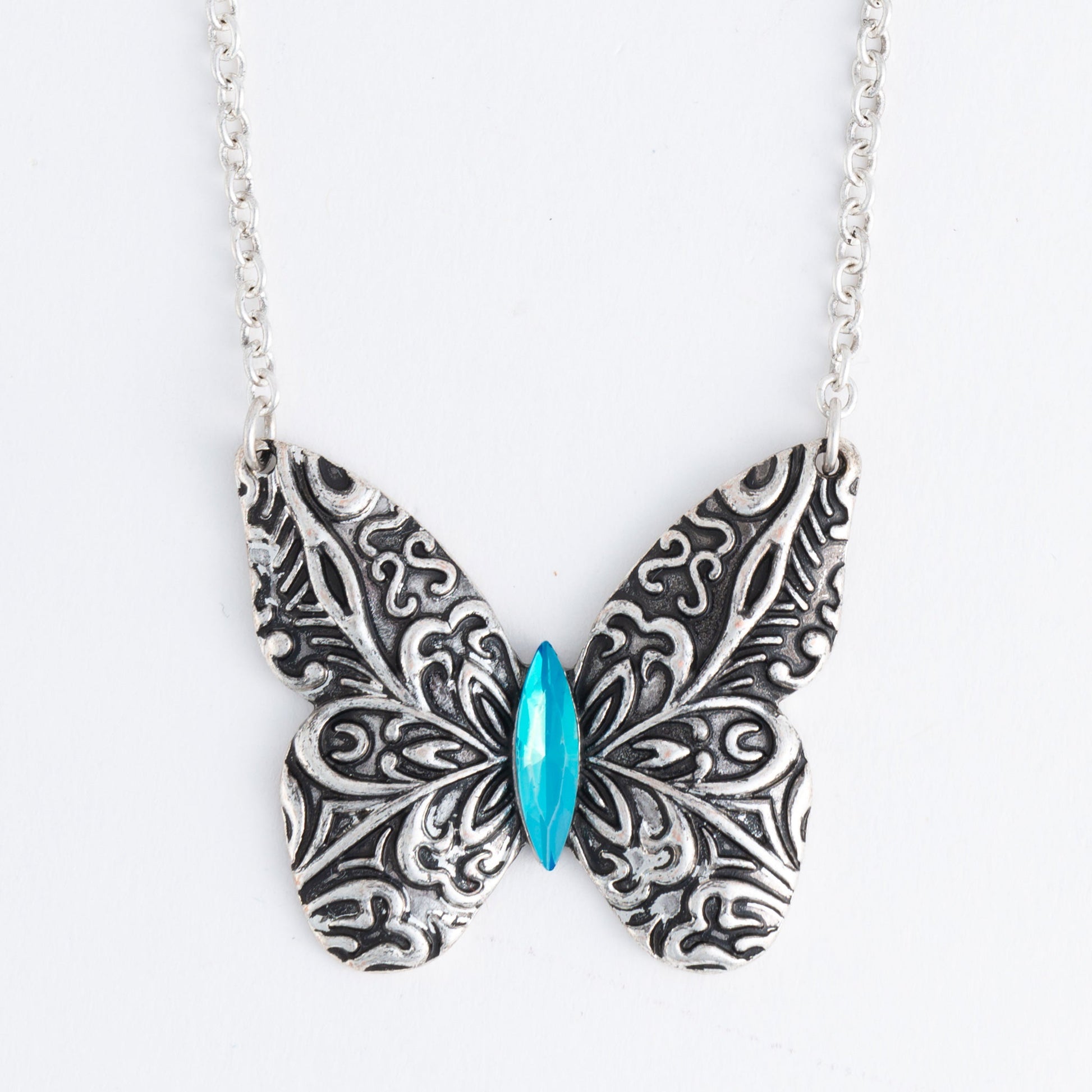Add a bit of whimsy to your wardrobe with the Zenni Engraved Butterfly Pendant Necklace. Featuring a delicate silver chain with intricately engraved butterfly pendant, this necklace makes a statement. Its bright blue glass stone only adds to its charm. Beautiful and easy to style, this necklace is sure to become a favorite.