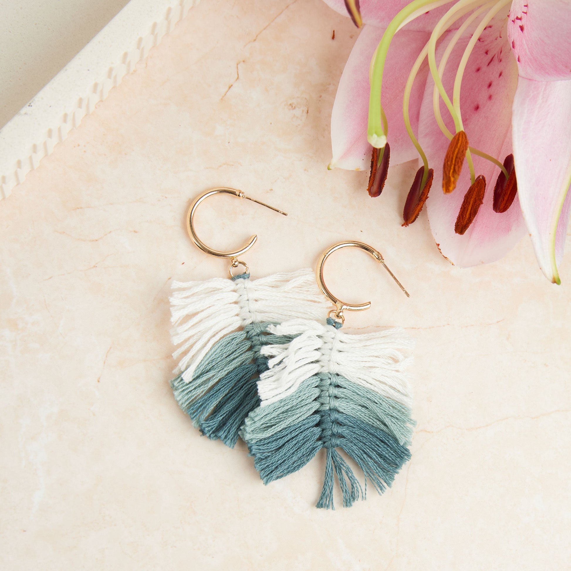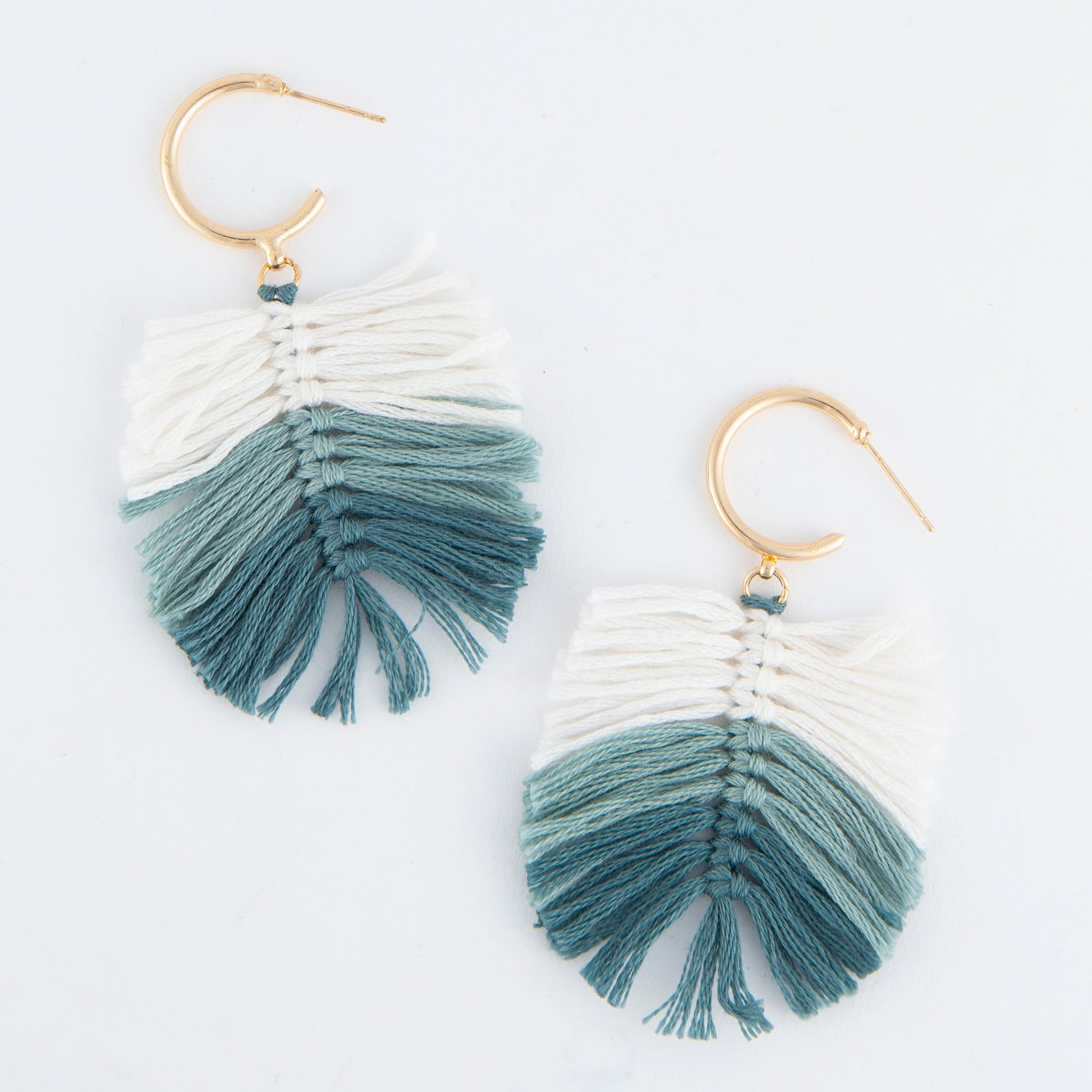 Bold and playful, the Zephyr Fringe Macrame Palm C Hoop Earrings feature a stunning palm leaf design made entirely in macrame. Dangling off a classic C Hoop, these earrings are easy to wear and sure to turn heads.